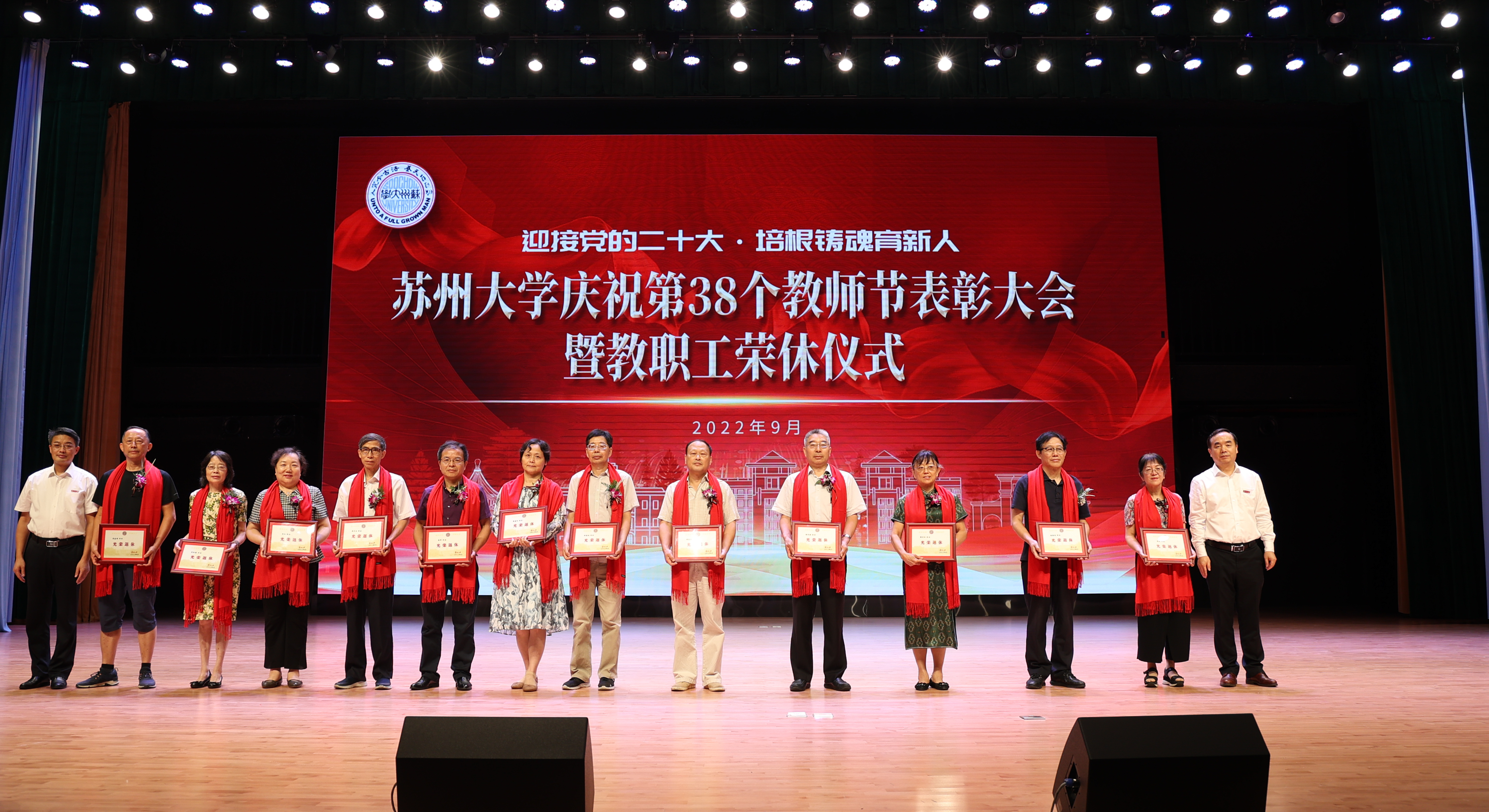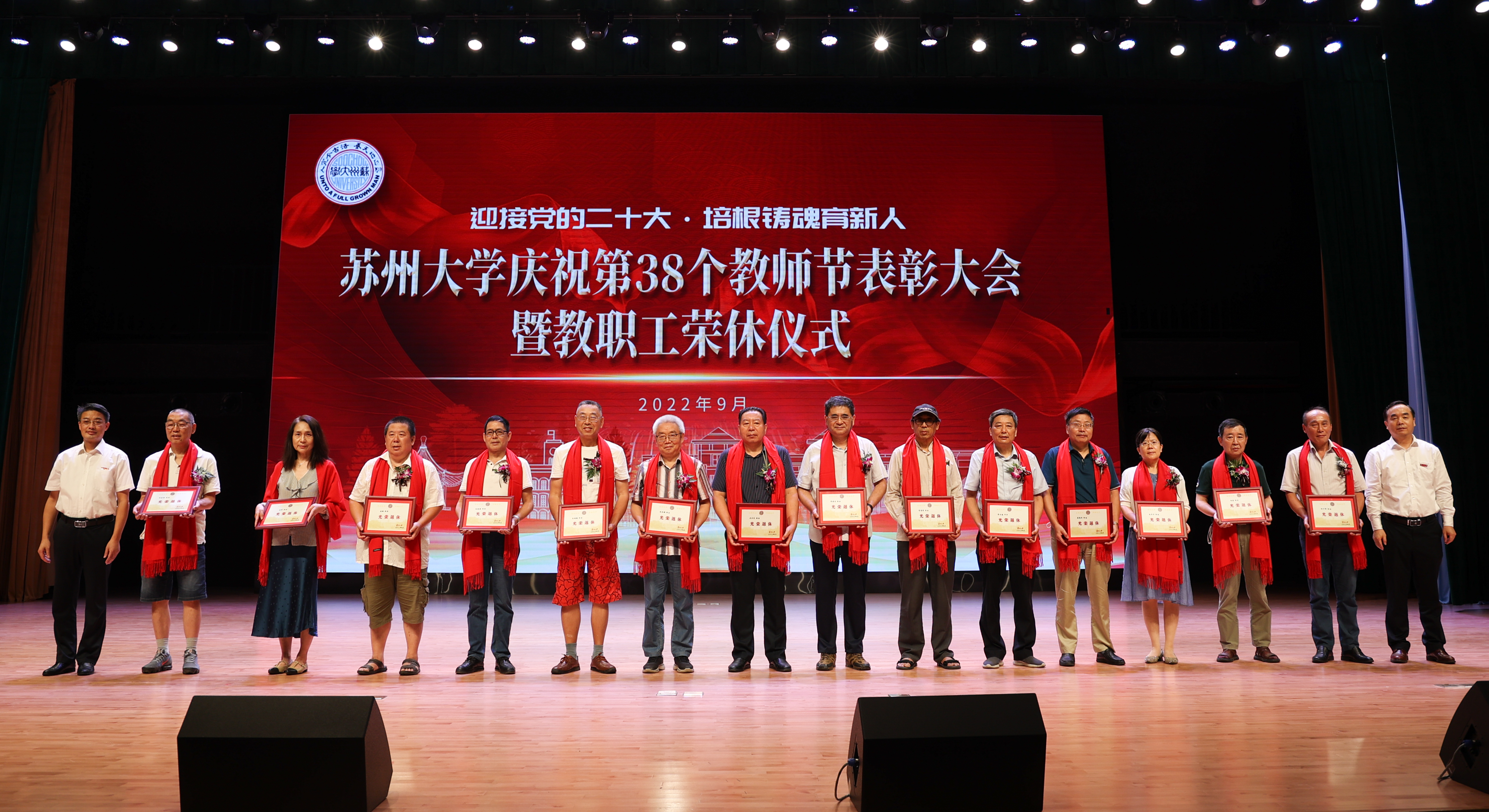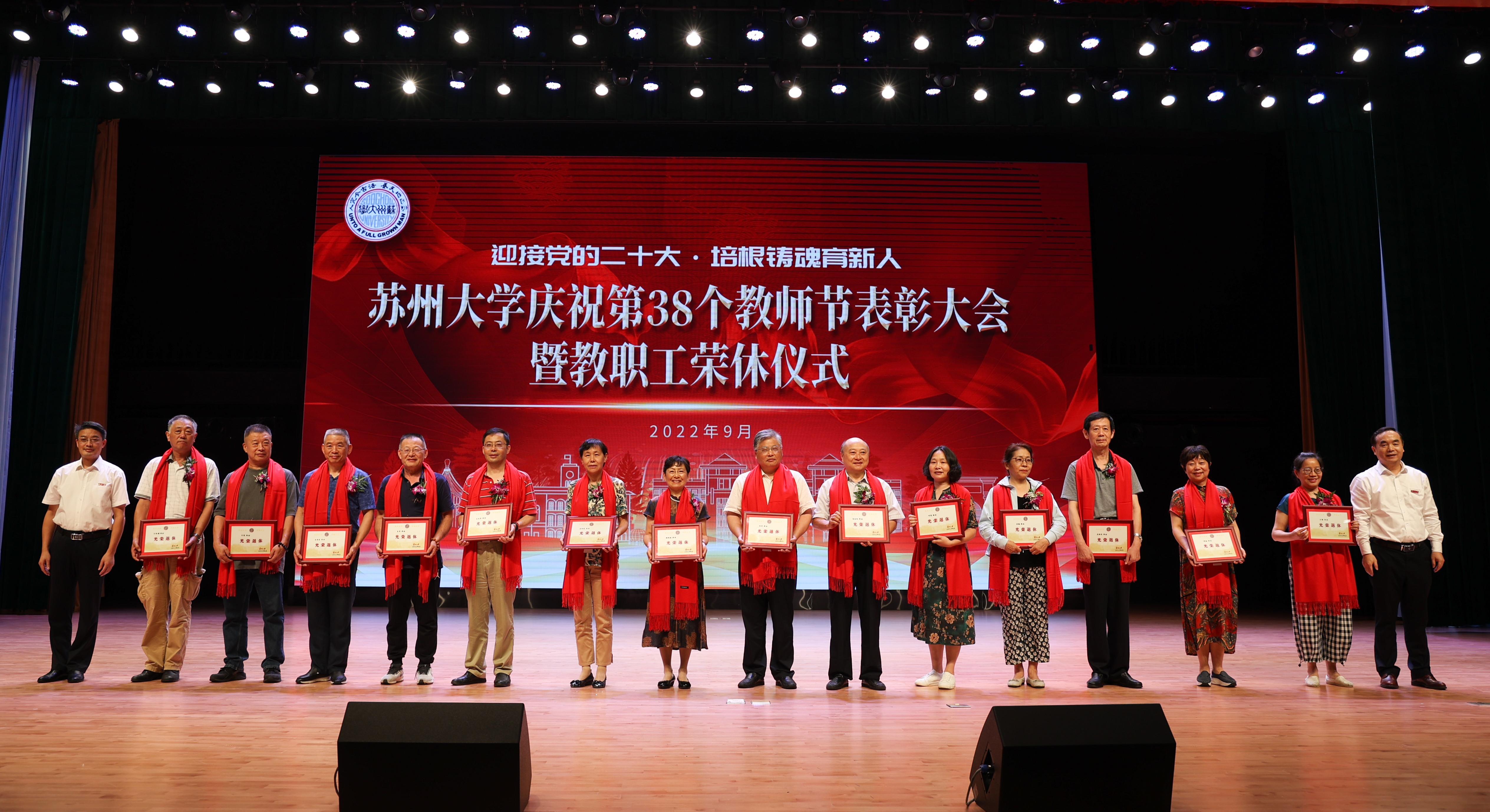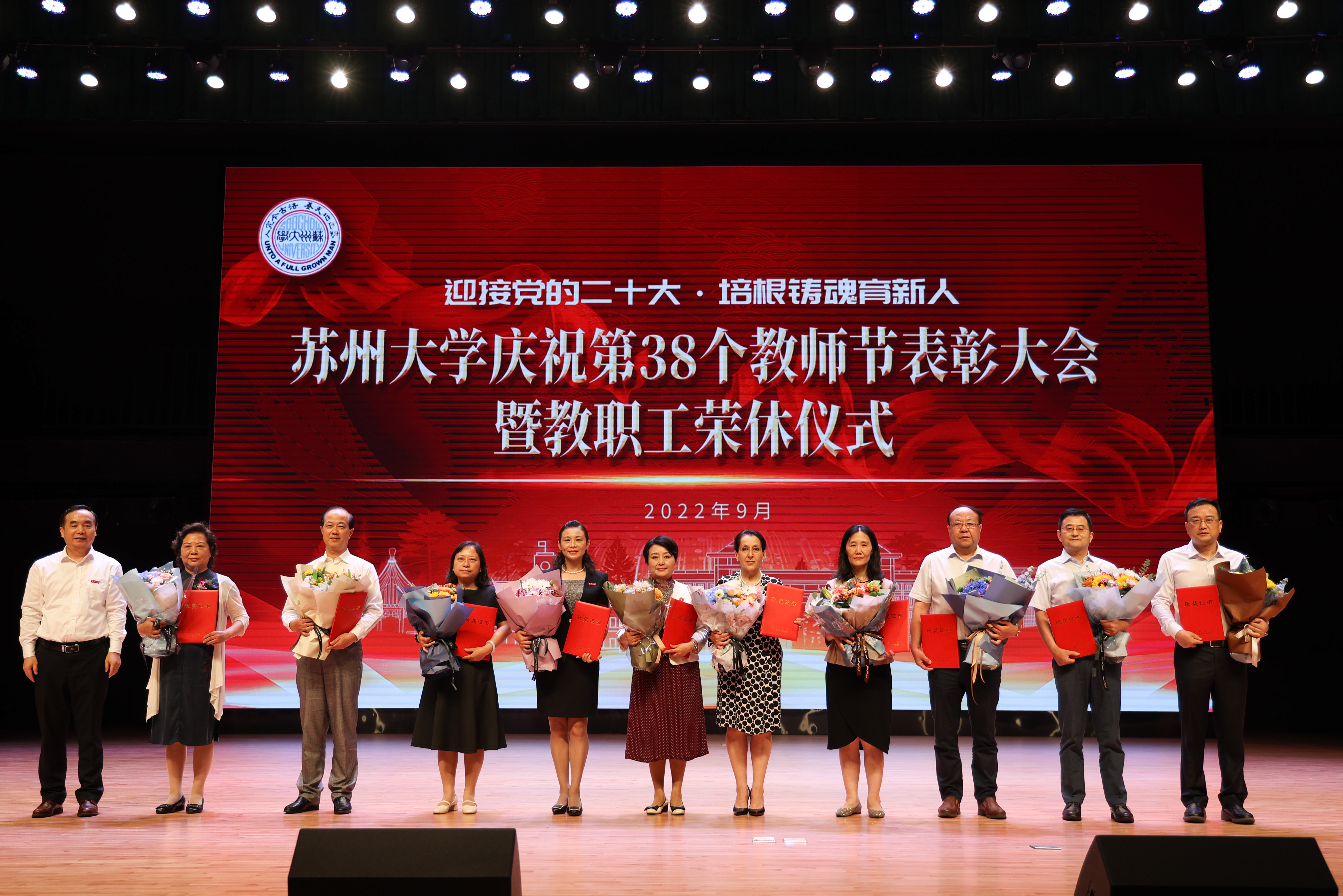 邓敏宣读了2022年度苏州大学高尚师德奖教金获奖名单、2022年度苏州大学“兴育新”宣传思想政治工作奖获奖名单、从事教育工作满30年教职工名单和荣休教职工名单。校党委常委、副校长姚建林宣读了近一年来学校、教师在省部级以上的主要获奖名单。张晓宏、邓敏逐一为获奖教师颁发证书并合影留念。