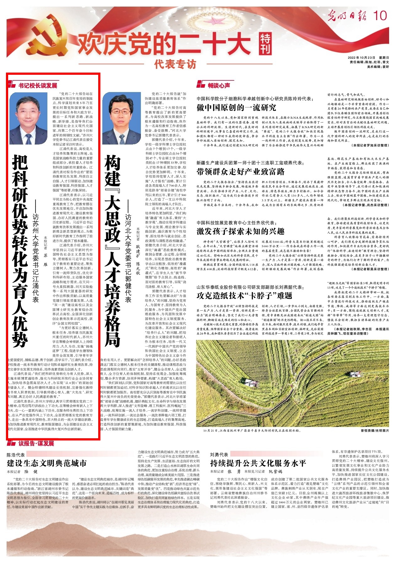 10月16日至22日,中国共产党第二十次全国代表大会在北京胜利召开。党的二十大代表、苏州大学党委书记江涌参加盛会,并接受《人民日报》、新华社、《光明日报》、《中国教育报》、《新华日报》、江苏卫视、《苏州日报》等国家和省市级媒体采访,分享学习收获和感想感悟,介绍学校五年来发展成绩和未来发展目标和工作任务。