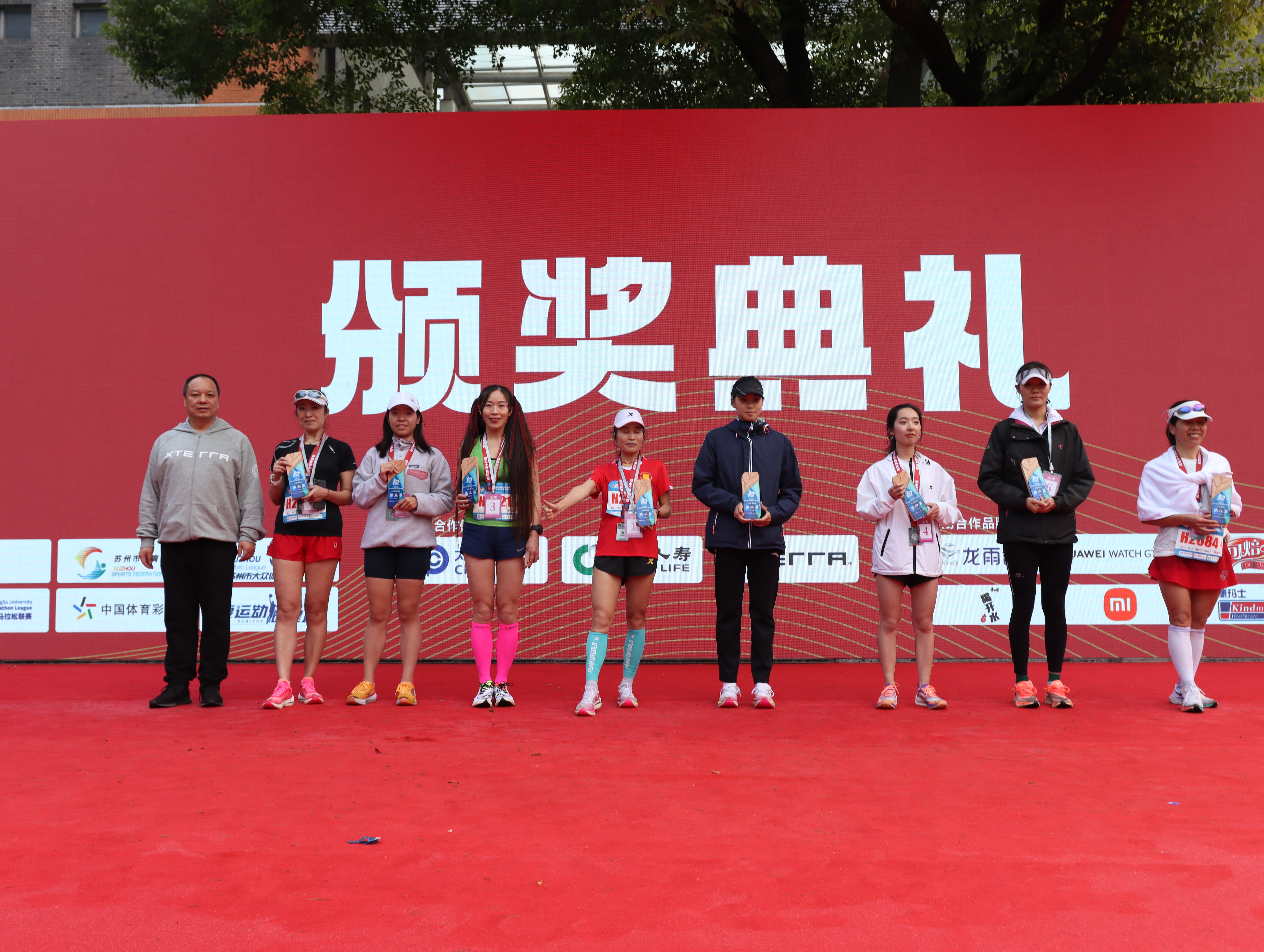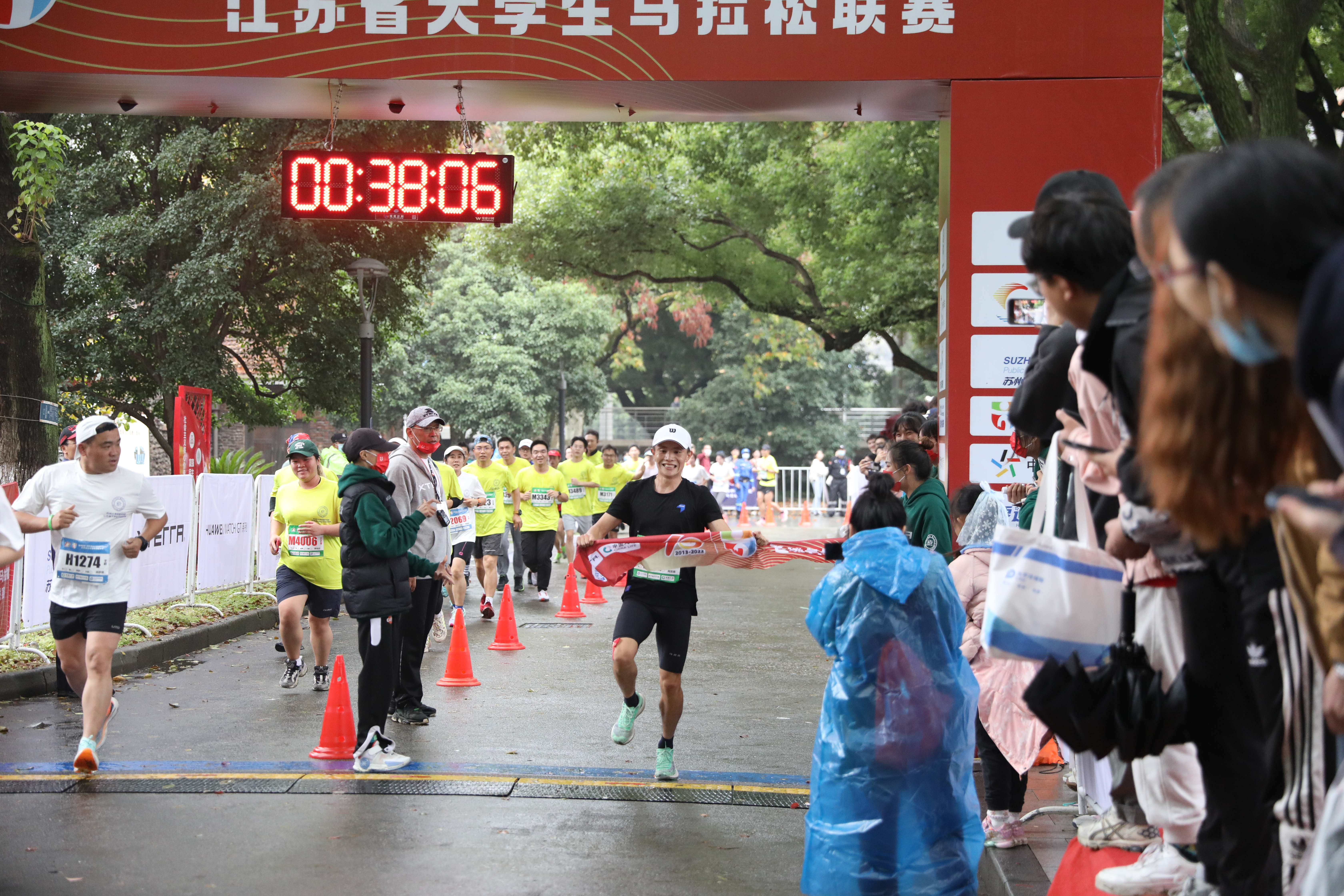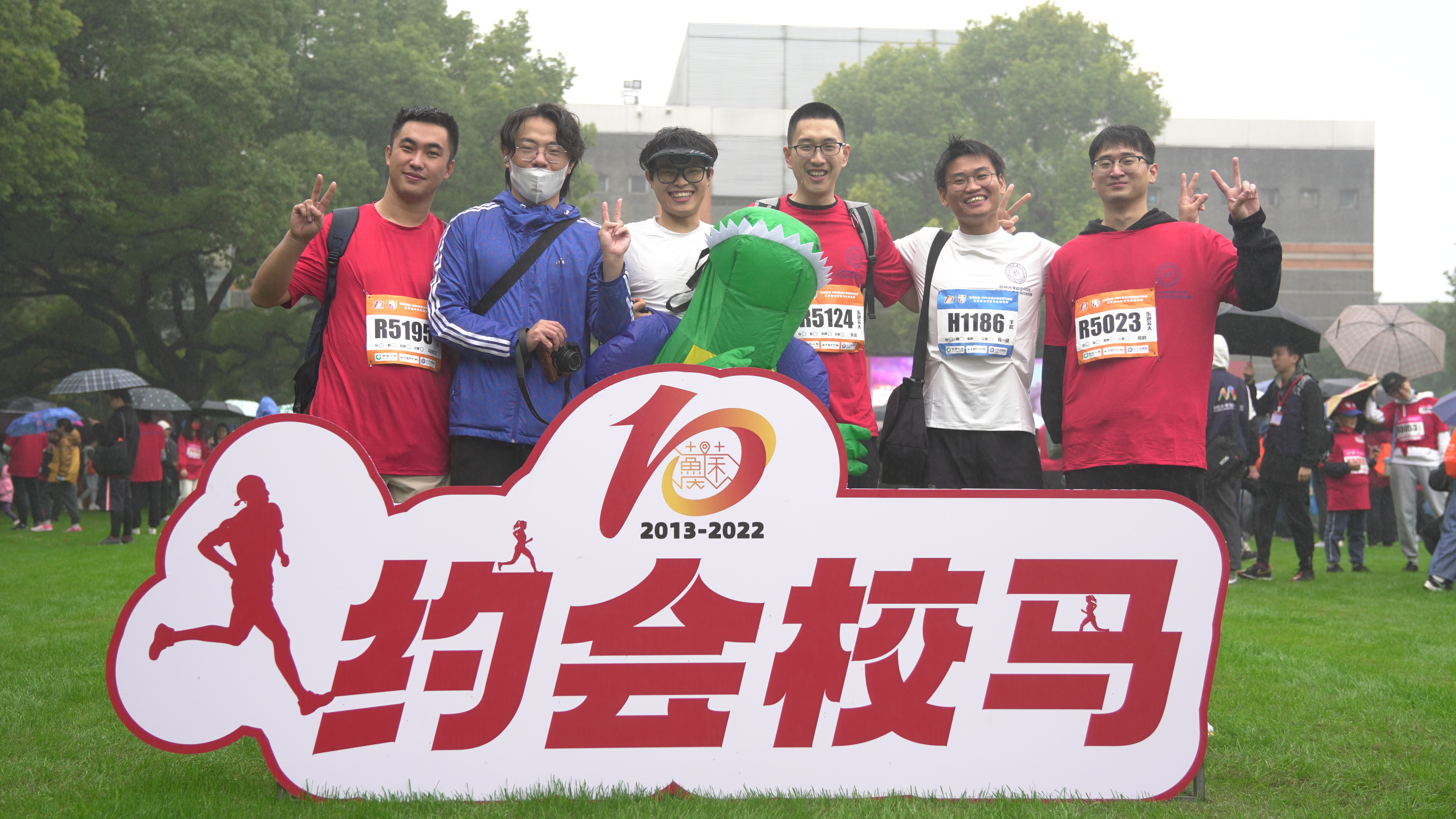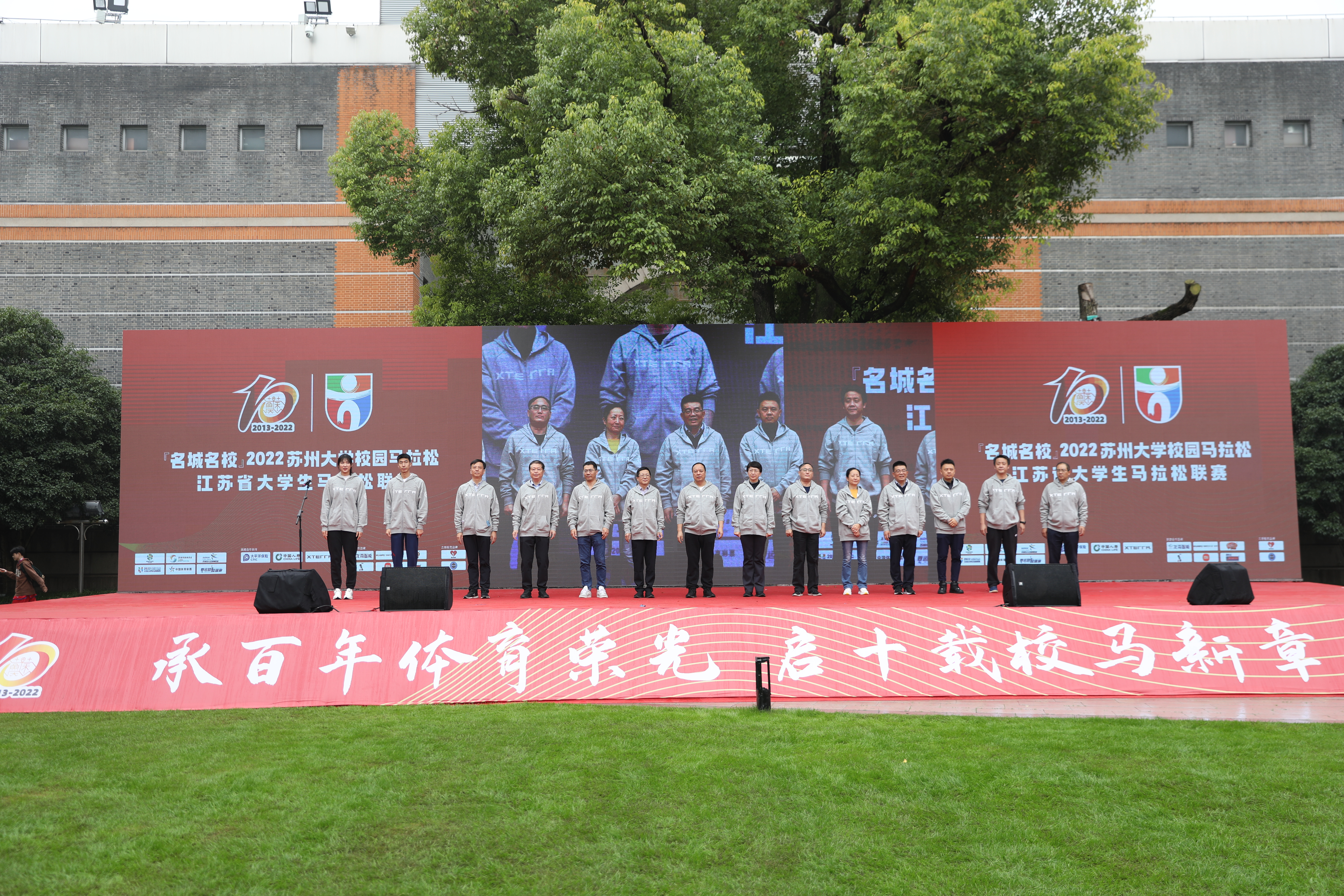 在激动澎湃的音乐声中,参赛者纷纷来到钟楼前草坪集合。虽然天空阴雨绵绵,但现场已被大家的激情点燃,苏大学生及幼儿园小朋友带来精彩表演为跑者们加油打气。出席活动的领导和嘉宾、历届各项赛事的冠军代表上台,为“名城名校”2022苏州大学校园马拉松赛暨江苏省大学生马拉松联赛各项赛事鸣笛发枪。