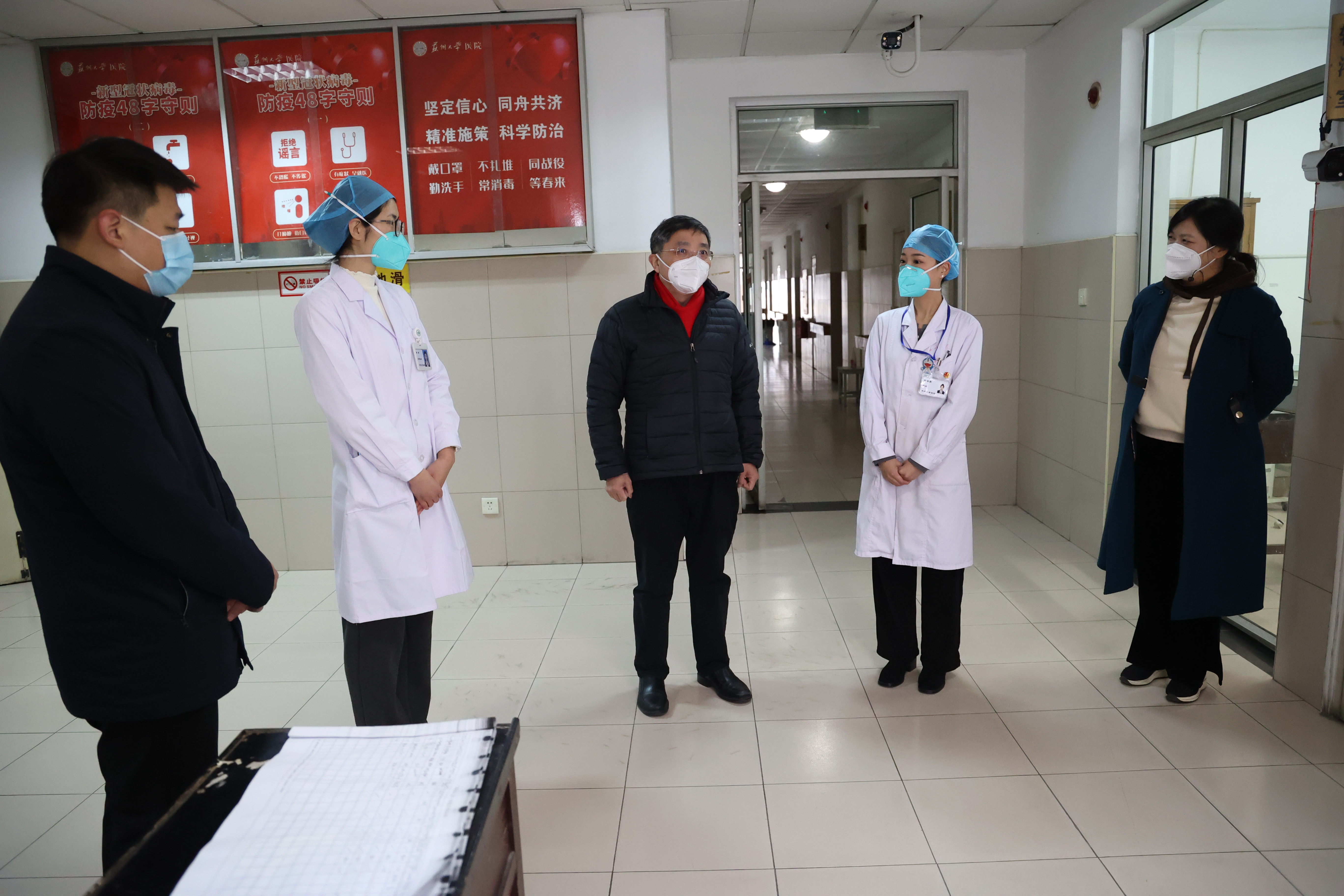 随后,江涌一行走进东区校医院,仔细询问了节假日期间校医院值班和接诊情况。他表示,过去的一年,在疫情处置的大战大考中,校医院医护人员不辞辛苦,高负荷工作,为守护师生健康作出了重要贡献。他希望大家在春节期间坚守岗位的同时做好个人防护,为师生度过一个健康祥和的春节保驾护航。