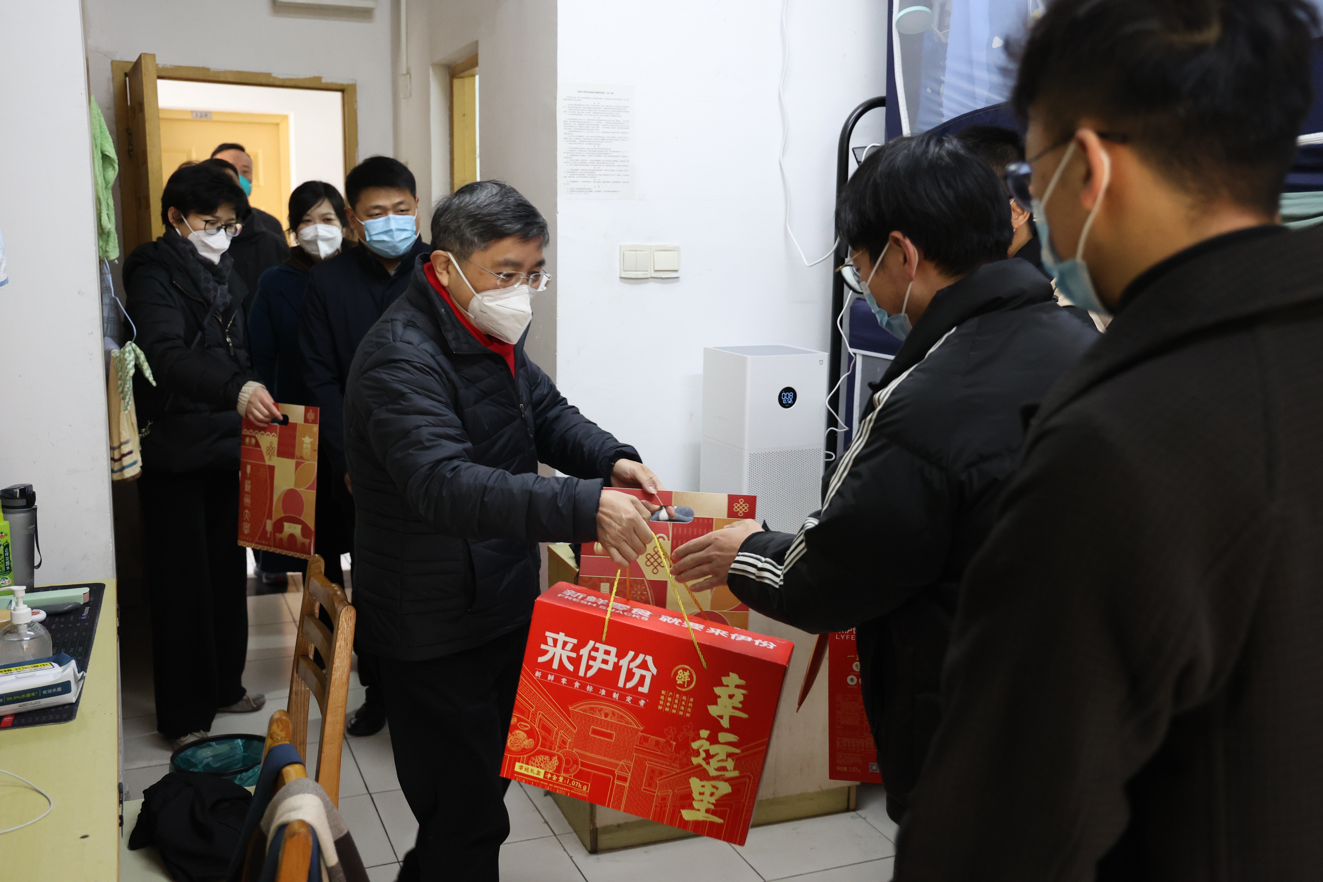 江涌走进学生宿舍,为留校过年的学生送上精心准备的新春大礼包。在和同学们的亲切交谈中,他叮嘱同学们在科研和学习之余,注意劳逸结合。同时要求各部门负责人主动了解寒假留校学生需求、切实解决同学们的实际困难,让留校学生在校如家、温暖过年。他还向坚守岗位的宿管工作人员送去了慰问和祝福。大家都表示,感谢校领导的关心慰问,一定坚守好岗位,认真努力工作,保障节假日期间的校园安全稳定。