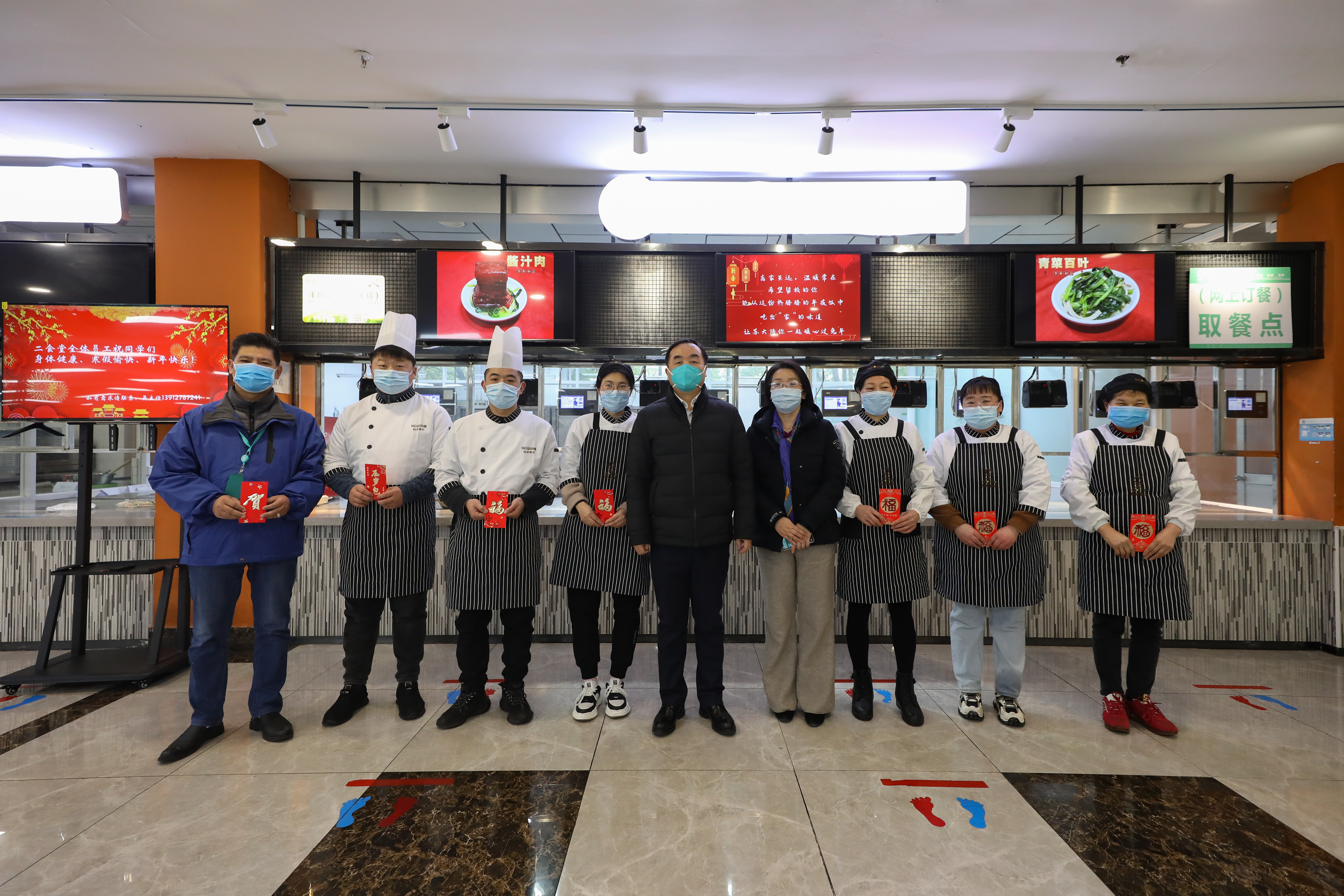 在阳澄湖校区,张晓宏一行看望慰问了坚守一线的门卫和值班保安,感谢他们为学校安全运行作出的贡献,并送上新年红包,致以诚挚的问候和新春祝福。随后,张晓宏一行走进阳澄湖校区三楼食堂,慰问了寒假期间坚守岗位的后勤职工,了解了假期值班食堂的菜品供应情况,并提醒大家要时刻保证食品安全。