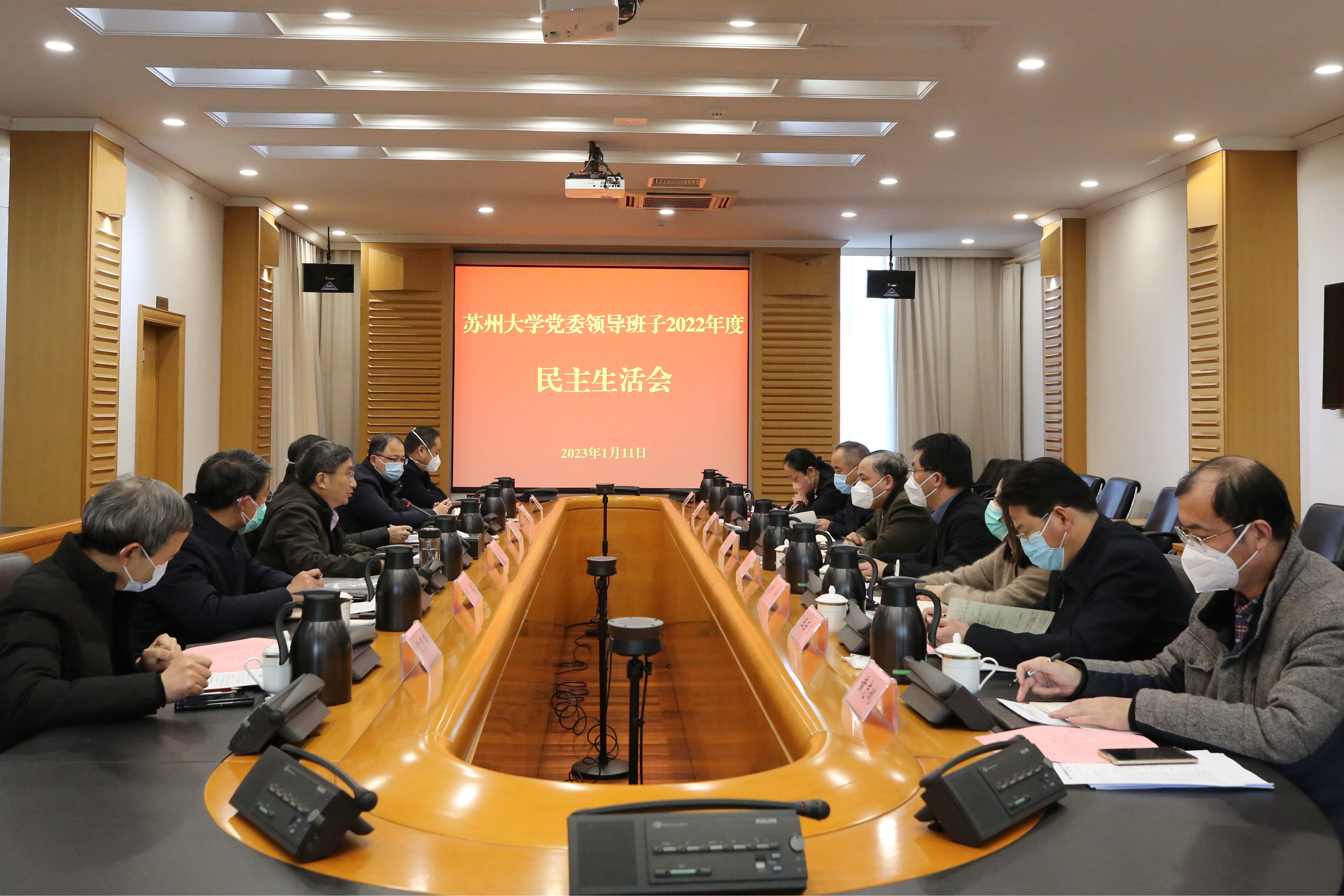 1月11日下午,校党委领导班子召开2022年度民主生活会。会议以全面贯彻习近平新时代中国特色社会主义思想,深刻领悟“两个确立”的决定性意义,增强“四个意识”、坚定“四个自信”、做到“两个维护”,团结带领党员干部群众以奋发有为的精神贯彻落实党的二十大作出的重大决策部署为主题,联系党委常委会工作,联系带头做到“两个维护”、带头用习近平新时代中国特色社会主义思想凝心铸魂、带头坚持和加强党的全面领导、带头坚持以人民为中心的发展思想、带头发扬斗争精神、带头落实全面从严治党政治责任等方面的实际,总结成绩,查摆不足,进行党性分析,严肃认真开展批评和自我批评。校党委常委参加会议,非党员校领导、纪委副书记、两办主任列席会议。会议由校党委书记江涌主持。