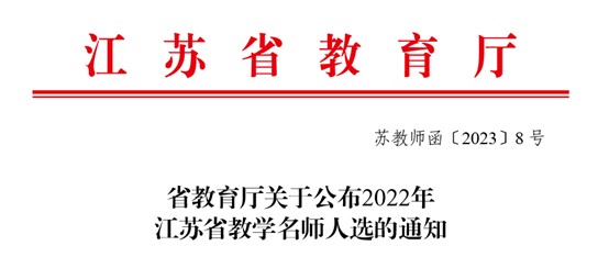 江苏省教学名师是省教育厅为全面贯彻习近平总书记关于教育的重要论述和中央人才工作会议精神,加快建设高素质专业化创新型教师队伍,制定的高层次教育人才支持计划。此次评选共选出2022年江苏省教学名师300人,其中普通高等学校100人。我校将以此为契机,进一步推动学校教学团队建设和青年教师培养,发挥教学名师在高质量教师队伍建设中的引领作用,全面促进我校教师教育教学水平提升。