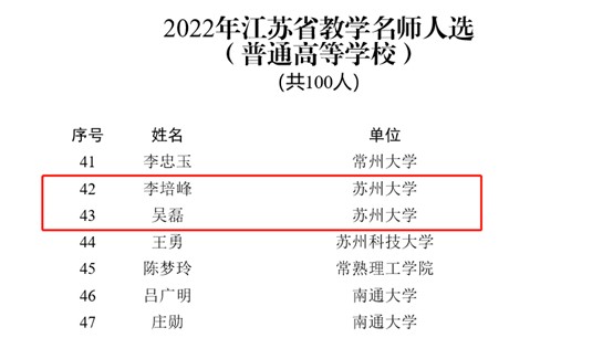 近日,江苏省教育厅公布了2022年江苏省教学名师人选,我校李培峰、吴磊两位教师成功入选。