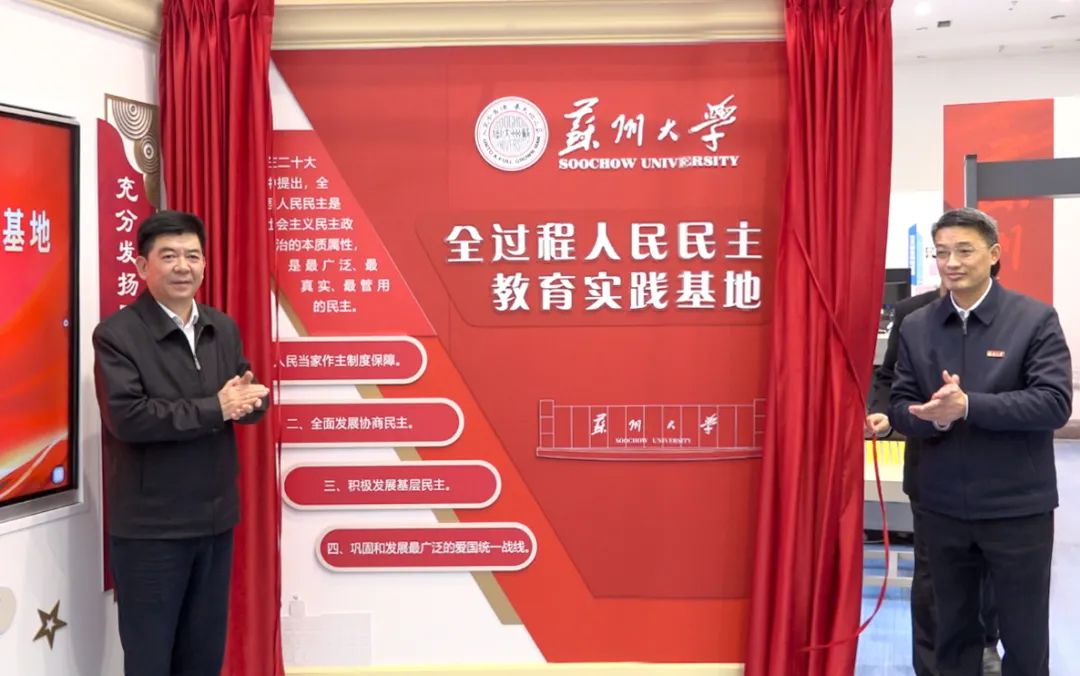 4月7日上午,我校“全过程人民民主基层实践基地”揭牌仪式在苏州大学天赐庄校区博物馆举行。校党委副书记邓敏,苏州市人大常委会副主任温祥华,校党委常委、统战部部长黄志斌,姑苏区人大常委会主任郦小萍及苏州市人大、姑苏区人大等相关人员出席揭牌仪式。仪式由黄志斌主持。