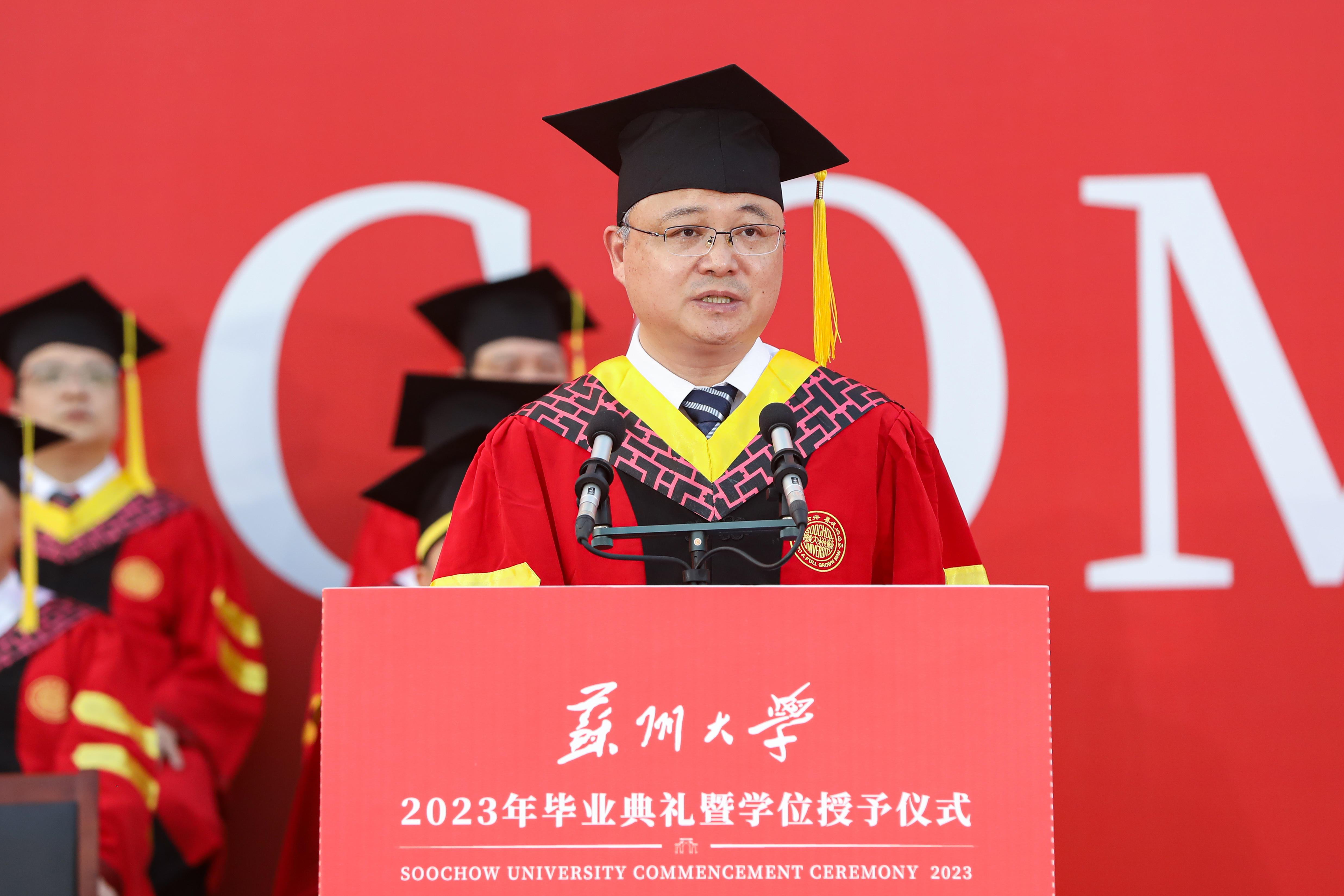在大学的“最后一课”上,家国责任与时代担当,科技进步与百姓福祉等饱含兼济天下情怀的期望与嘱托,直击在场毕业生的心灵。张晓宏强调,希望每位苏大学子一直走在追光的道路上,勇于发挥光的能量,汇聚成前行的力量,挺起时代的精神脊梁;要科学调控光的亮度,在理性之光与感性之光、科学之光与人文之光的平衡中,看清自己、看清世界;更要尽力扩大光照范围,面对“中国之问、世界之问、人民之问、时代之问”,用书写答案的积极行动,点亮盛世的“时代之光”!