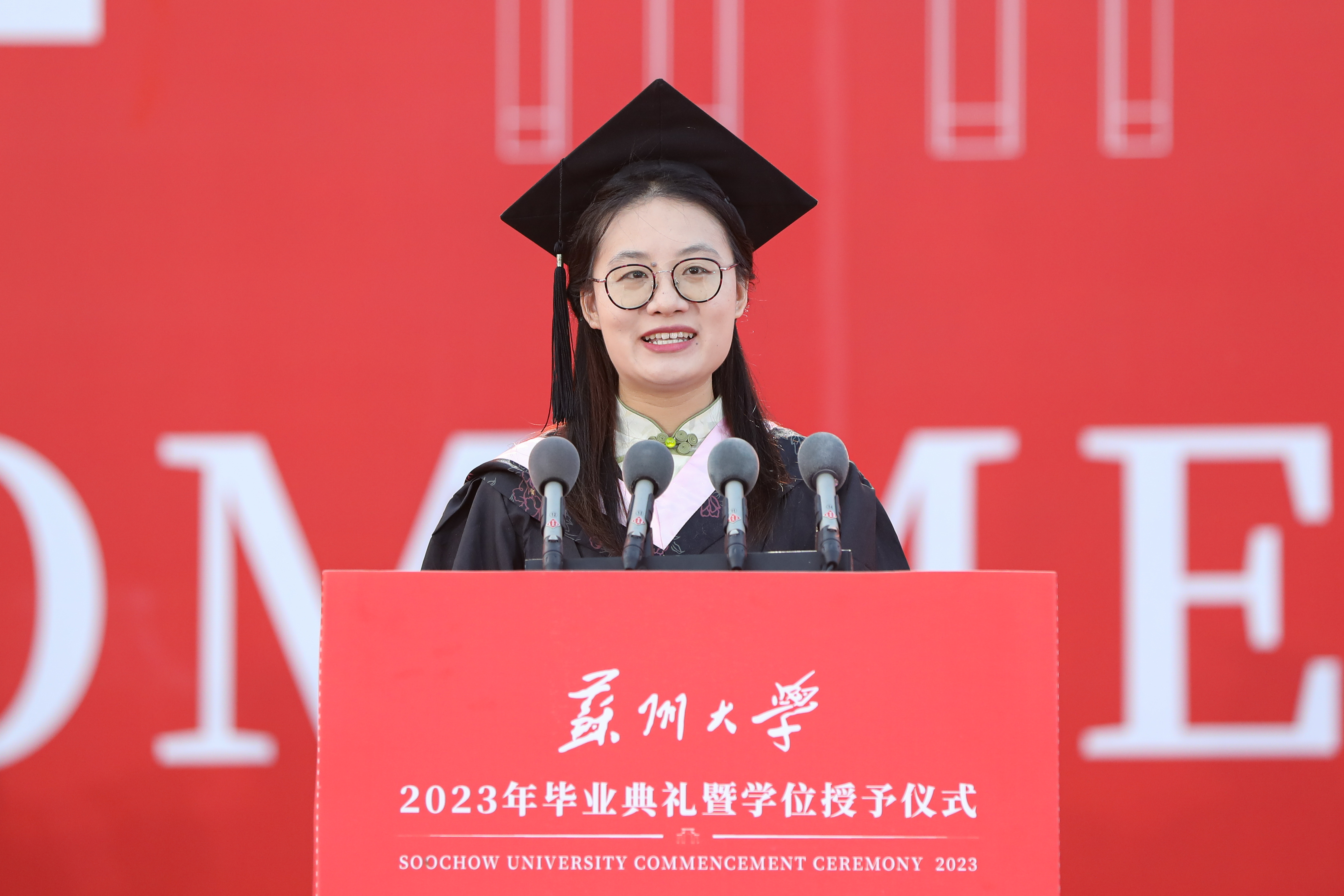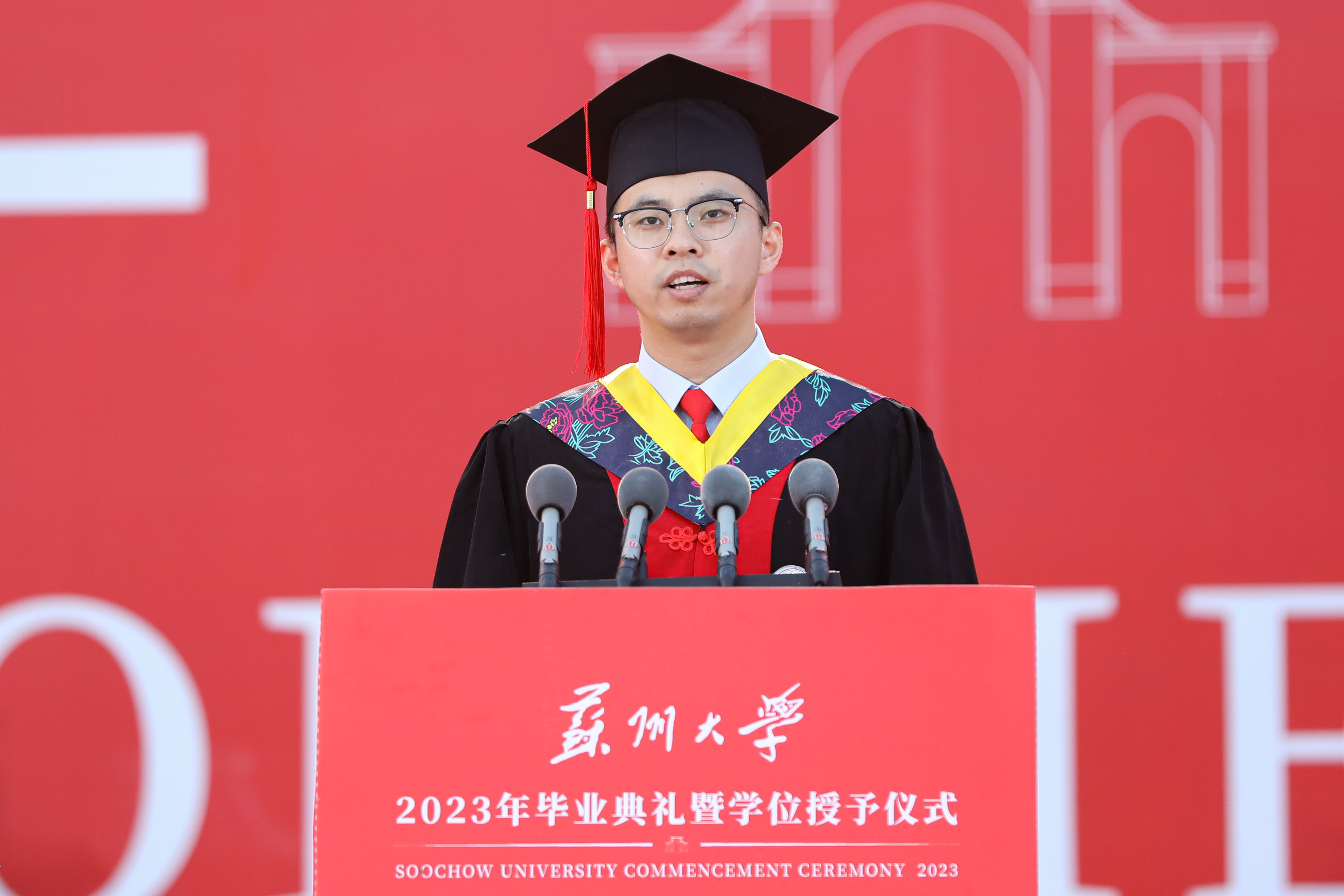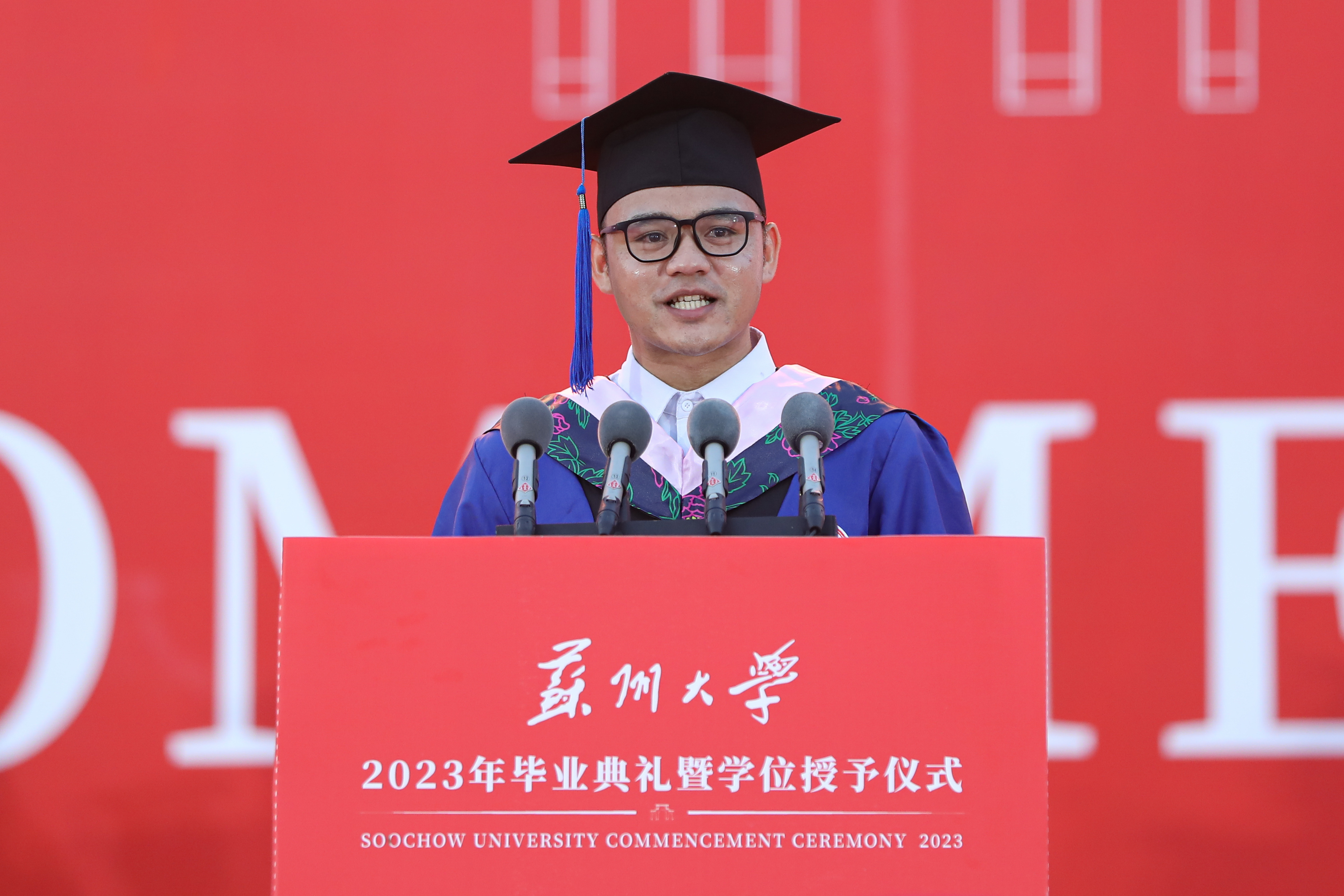 本科生代表、教育学院教育学(师范)专业学生陆莹绮分享了四年间在苏大的蜕变成长和感受到的学校日新月异的发展与变化。她说,母校是一个“追梦”“有光”和“书香”的地方,激励着大家踔厉奋发、勇毅前行,秉持使命担当,不负大国情怀。研究生代表、功能纳米与软物质研究院博士毕业生杨乃霖用“小与大”“挫与成”“梦想与践行”三组词概括了在苏大的学习收获。他表示,将在科研精神及家国情怀的感召下,专注科研事业,为实现国家高水平科技自立自强而奋斗。来自印度尼西亚的留学生代表、文学院汉语国际教育专业硕士研究生他路,用一口流利的中文回忆了在苏大学习生活的点滴。他感谢学校给了留学生们读懂中国、理解世界的机会,也期待能够用自己在中国学到知识和经验,为中印两国的交流合作贡献力量。