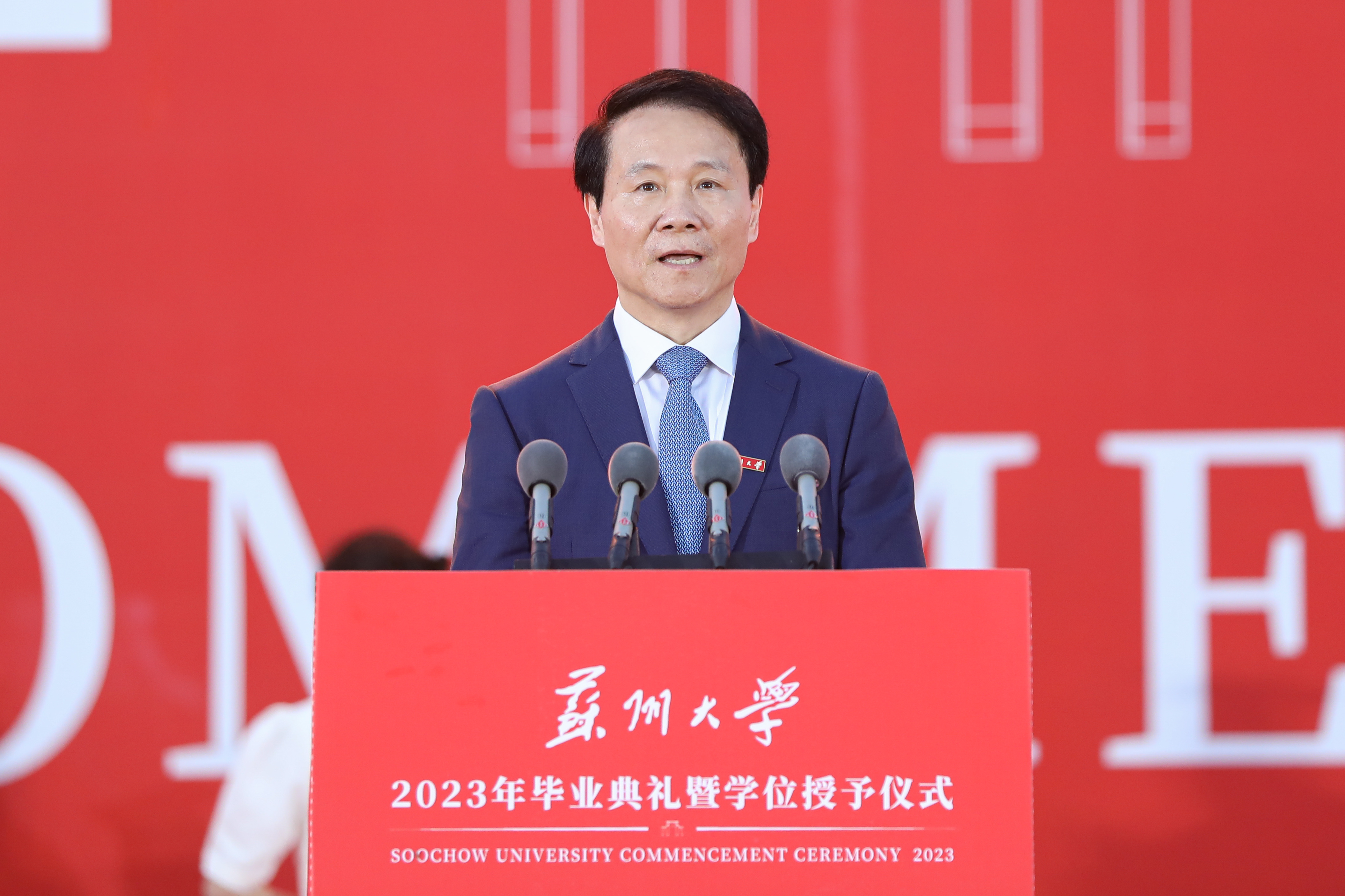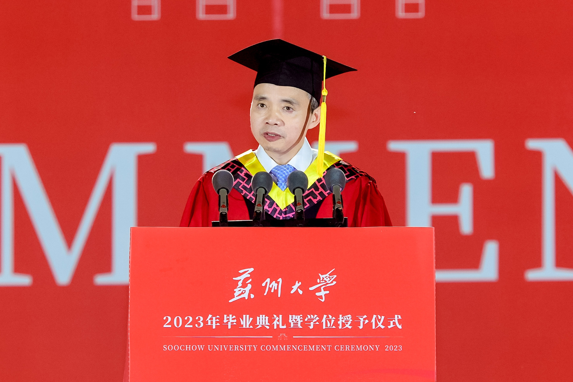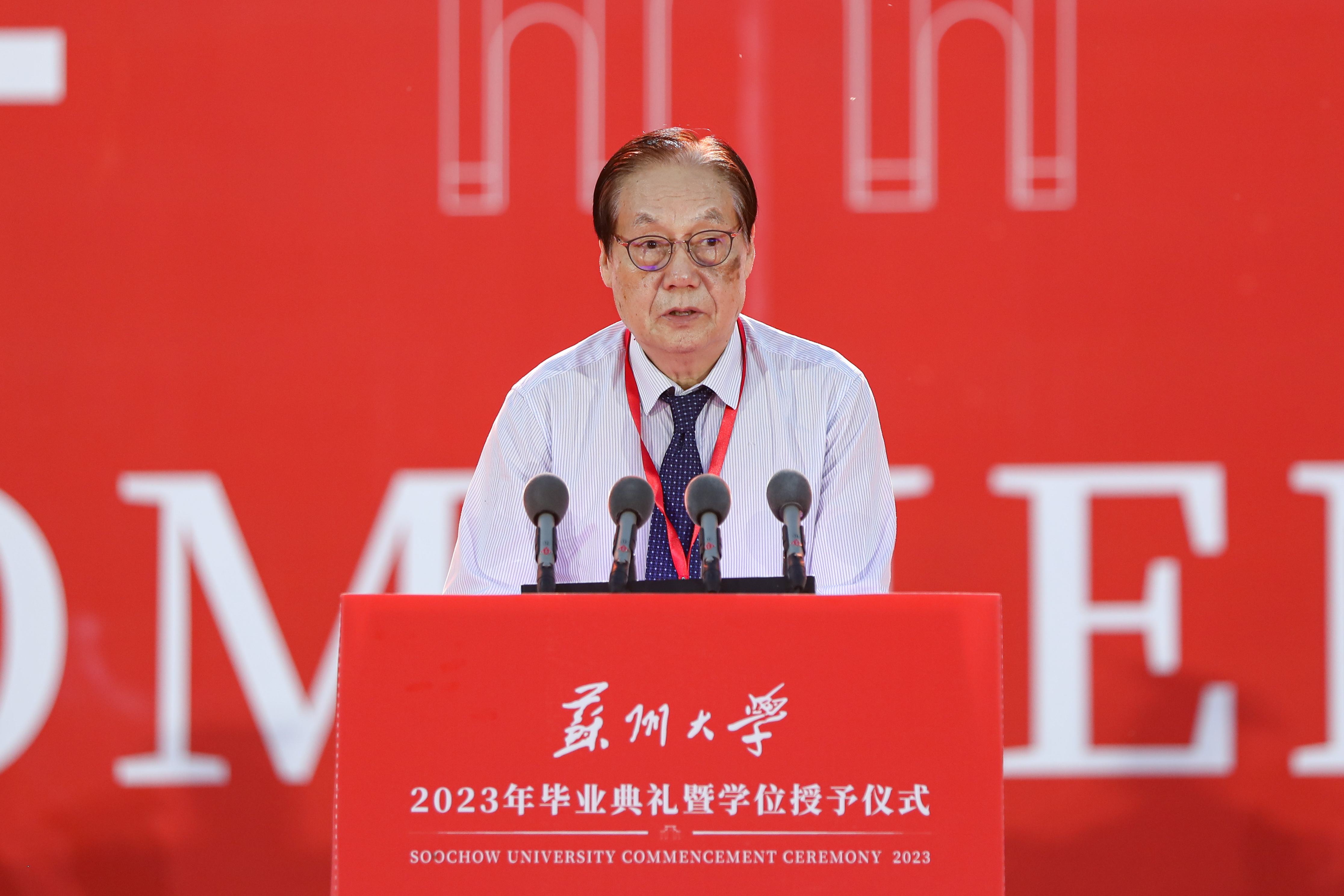 中国工程院院士、苏州大学苏州医学院院长詹启敏作为教师代表发言。他为同学们取得的成绩感到欣慰和自豪,祝贺大家毕业走向更广阔的天地。他说,希望毕业生们牢记学道无垠、与时俱进,志存高远、笃行不辍,心怀光明、正道直行,“无论你们走向何方,母校都是你们共同的根,让我们师生一起努力,滋养苏州大学这棵大树继续枝繁叶茂、摩云参天。”