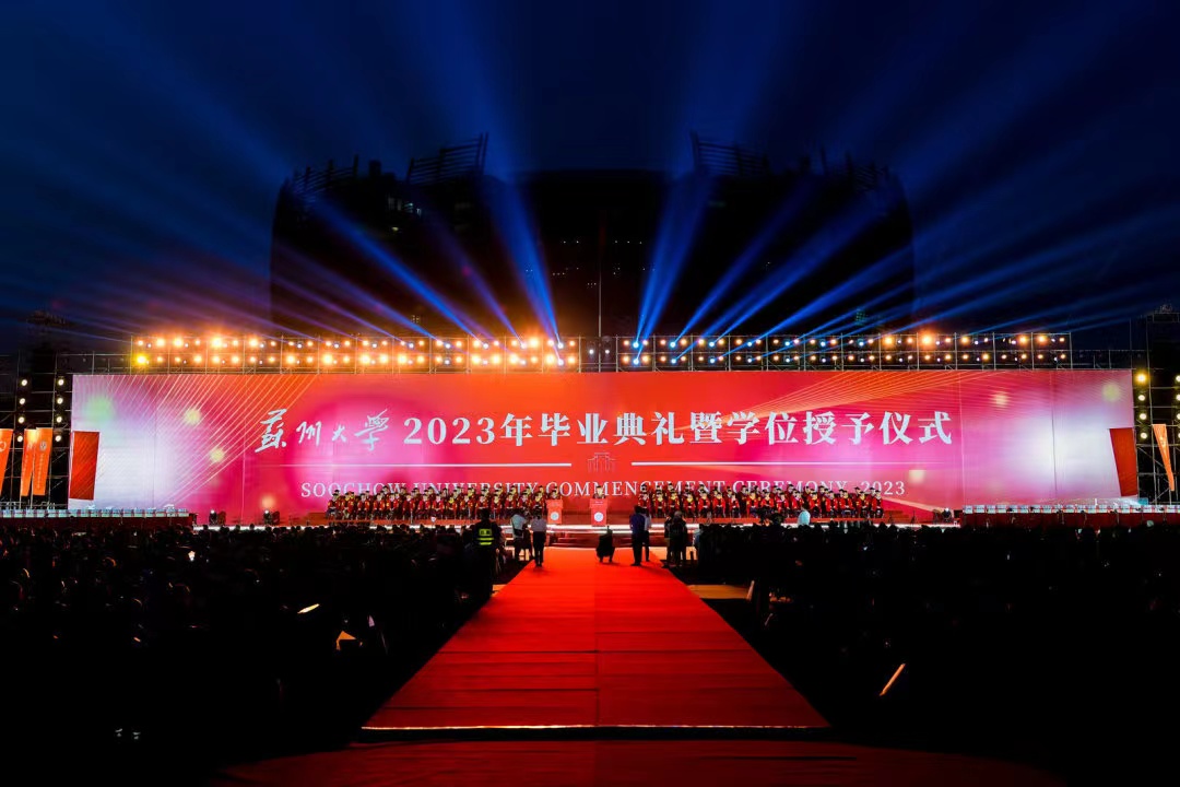 六月盛夏,芳草茵茵,校园里洋溢着毕业生们的欢声笑语。6月20日晚,我校在独墅湖校区恩玲艺术中心户外草坪举行2023年毕业典礼暨学位授予仪式。这场苏大学子们期待已久的毕业典礼,也是学校精心准备的一堂紧扣立德树人的“思政课”,庄重、典雅、温馨的现场氛围,激发起在场万余名师生深切的爱校情和爱国心。
