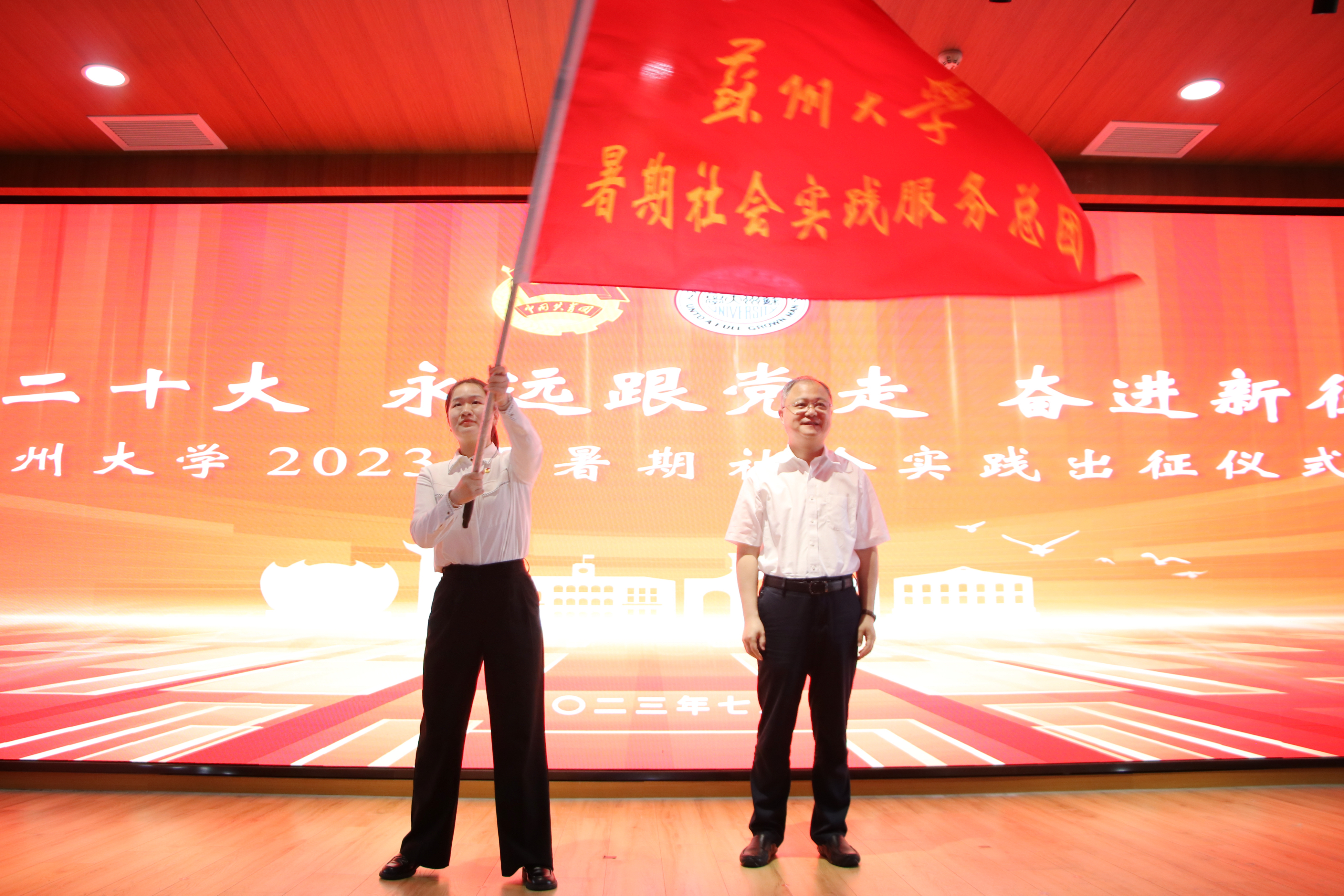 王鲁沛为苏州大学暑期社会实践服务总团授旗,并围绕践行习近平总书记对青年的期望,勉励我校青年学子要认真学习贯彻习近平新时代中国特色社会主义思想和党的二十大精神,把牢政治方向,树立远大理想,保持奋进姿态,紧扣实践主题。同时,牢记时代使命,培养奉献品格,不畏艰险,奋勇前行,主动投身新时代伟大实践,并发扬调查研究之风,把论文写在祖国大地上,下苦功夫、做真学问。此外,还要牢守“安全第一”的防线,做好安全预案,团队成员严守纪律,确保实践活动安全有序开展。