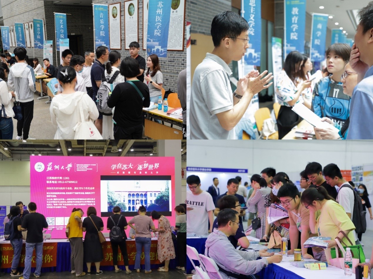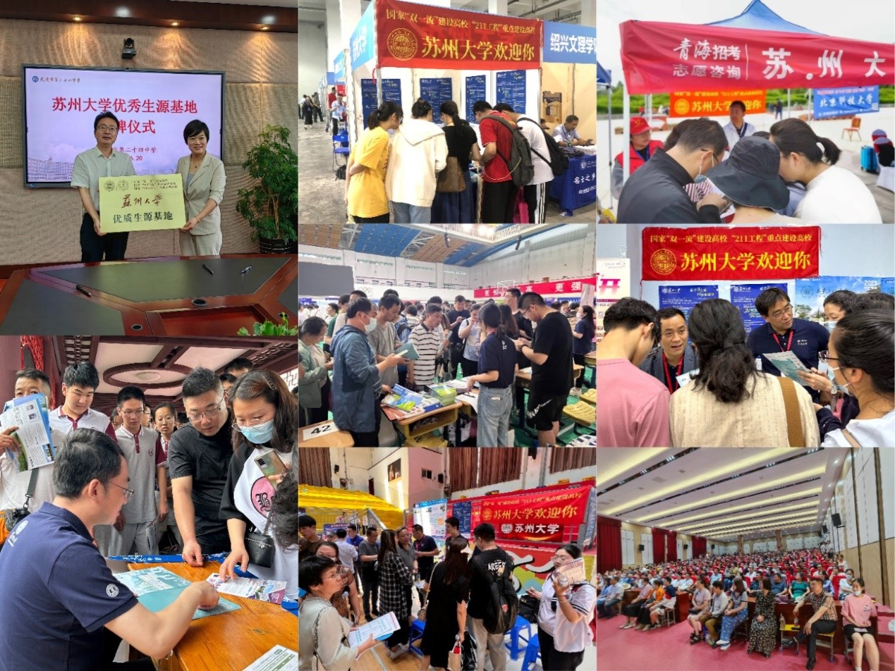 紧跟节奏不掉队,高考出分前夕,招生就业处处长靳葛专程走访连云港、宿迁、苏州等地多所中学,开展招生政策专题讲座和志愿填报指导服务,吹响了招生宣传的冲锋号角。各学院(部)招生组也积极行动,广泛开展各类招生宣传活动。线上,精心制作微信图文解读学院专业办学信息,线下,省内164场、省外208场招生宣传活动,苏大的展位前总是围满了前来咨询的家长考生,招生组老师一一解答填报问题,天南海北都留下了“苏大招生人”的身影,“苏大强”海报在各地醒目呈现。