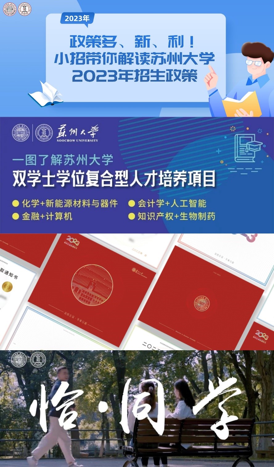 有讲不完的“干货”,也不能落下该有的仪式感和氛围感。6月15日,招办举办免费邮寄活动,将本科招生指南《与苏大共成长》送到近600名家长和考生手中,开启志愿填报前的“预热模式”。30日,“苏州大学录取通知书太用心了”词条登上新浪热搜榜,“高校录取通知书可以转转转,还有一个黑科技……”超话火速“出圈”,新华日报、中国青年报、紫牛新闻等十余家媒体争相报道,今年的苏大本科录取通知书再次收获如潮好评。以《流转东吴,华章日新》为主题,以流转的时间符号元素串连起苏州与苏大的时光经纬,在内页嵌入可以转动的圆盘,展现波澜壮阔的苏大办学史,寓意在时光的流转中与苏大共同奔赴美好未来。同期,本科招生宣传片《恰·同学》重磅上线,由学校师生自编自导自演,收获超高点击率。另有《“苏大人”的星辰大海》《食在苏大,不止果腹》《多面“苏大人”》《师说苏大》多个主题展现学校魅力,《听苏大学姐说》短视频火爆朋友圈。