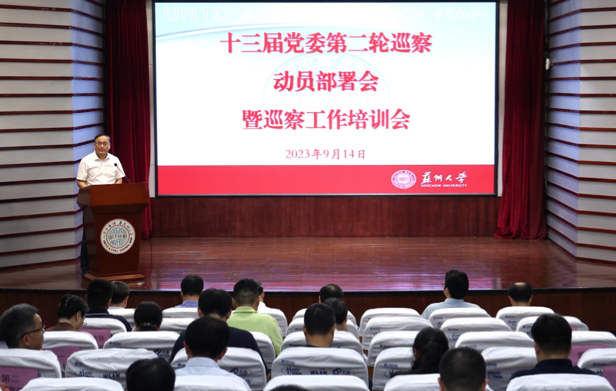 为全面贯彻落实党中央决策部署,扎实推动巡察工作高质量发展,9月14日下午,校党委在红楼会议中心学术报告厅召开苏州大学十三届党委第二轮巡察动员部署会暨巡察工作培训会。校党委巡察工作领导小组全体成员,第二轮巡察各巡察组全体成员及被巡察党组织相关人员,巡察办公室有关人员参加了会议。会议由校党委常委、纪委书记、派驻监察专员、巡察工作领导小组副组长宫向阳主持。