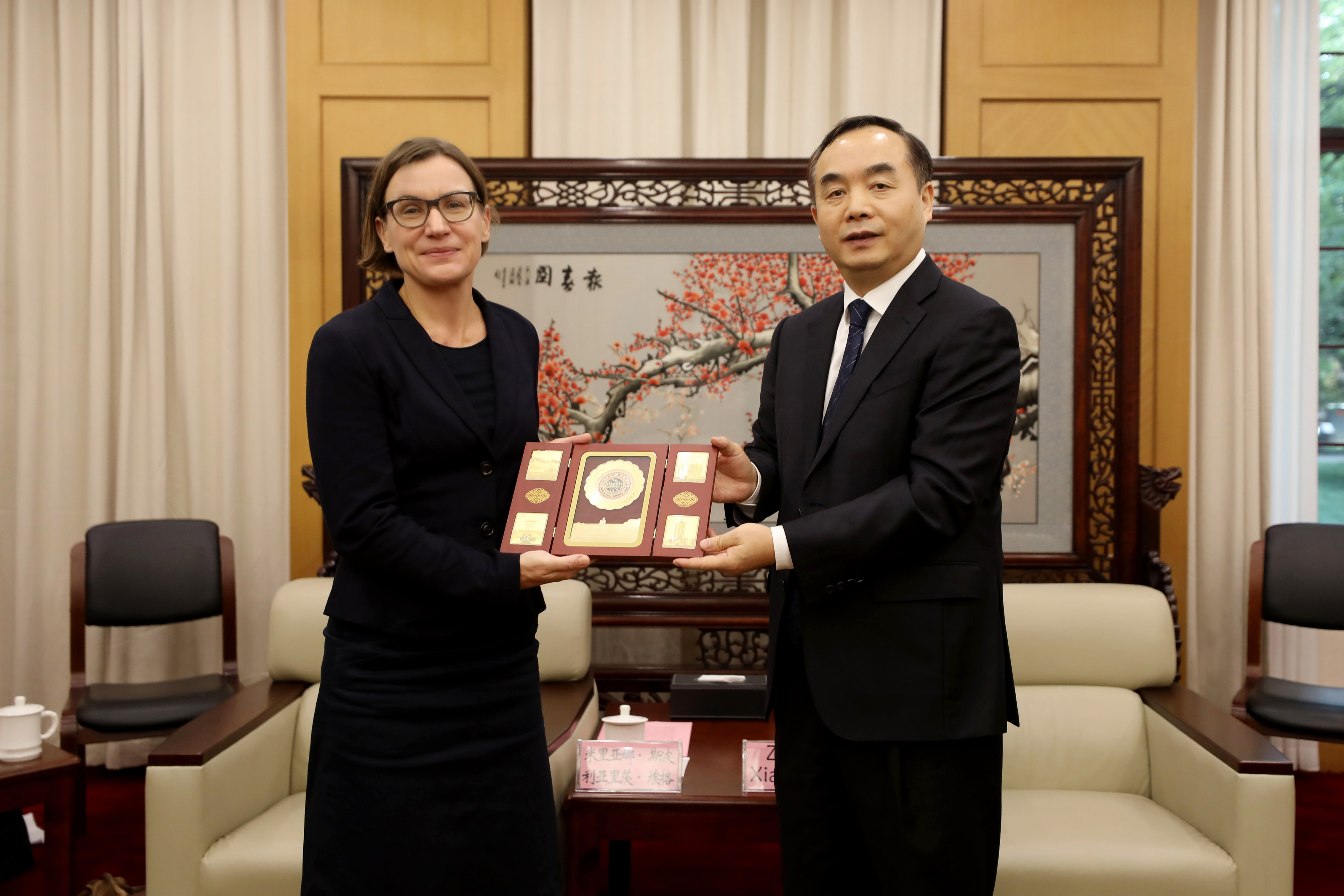 演讲前,斯波利亚里茨在红十字国际学院院长王汝鹏,我校副校长、红十字国际学院执行院长沈明荣等陪同下,参观了苏大校园和红十字国际学院办公楼。