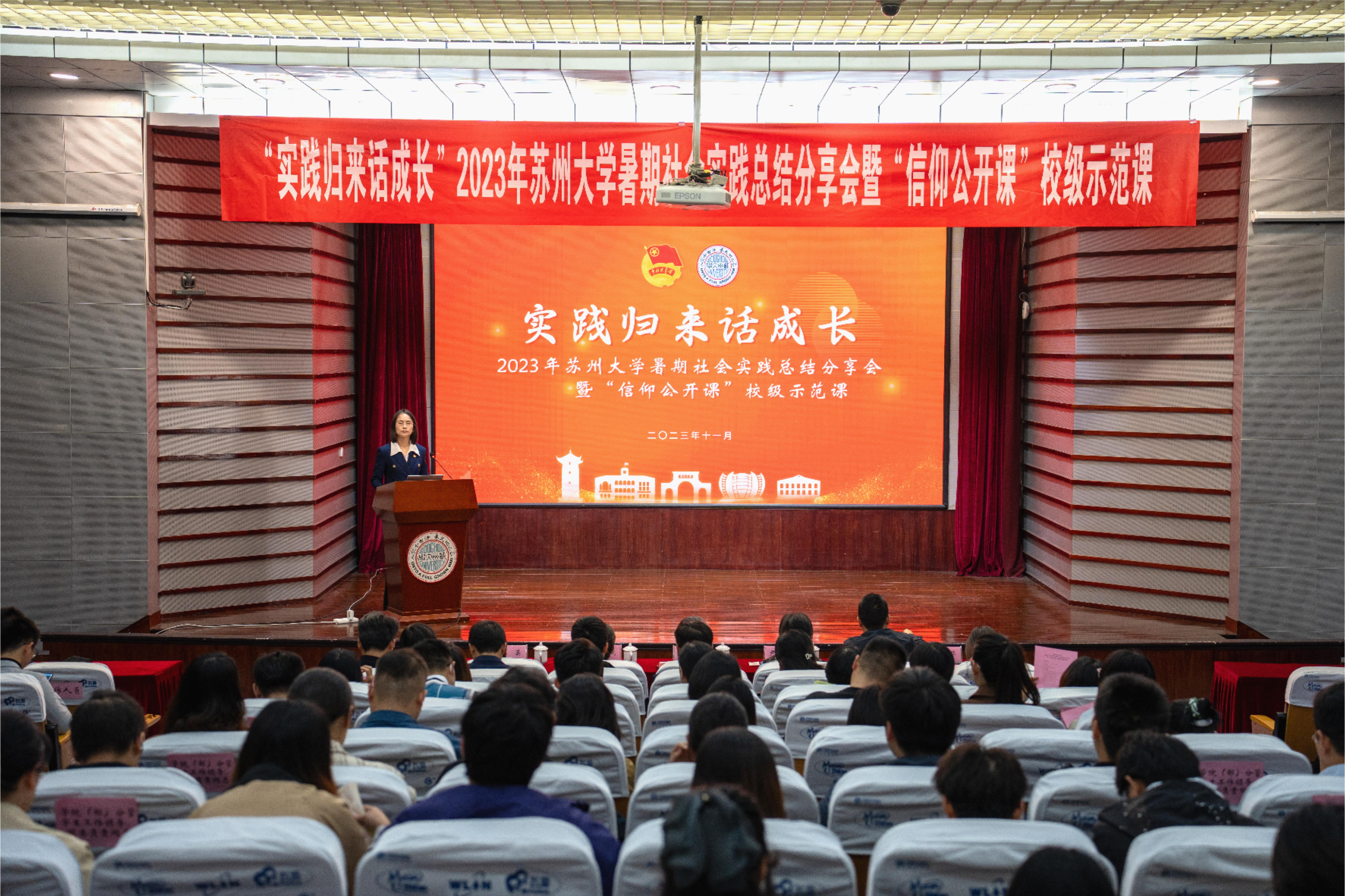 11月8日,“实践归来话成长”2023年苏州大学暑期社会实践总结分享会暨“信仰公开课”校级示范课在天赐庄校区红楼学术报告厅举行。校党委副书记邓敏,党委组织部、党委宣传部、团委、招生就业处、学生工作部(处)、党委研究生工作部、国际合作交流处、艺术教育中心等部门负责人,学院(部)分管学生工作的负责人、团委负责同志、暑期社会实践工作指导老师和团员青年代表参加活动。活动由校团委副书记严韵致主持。