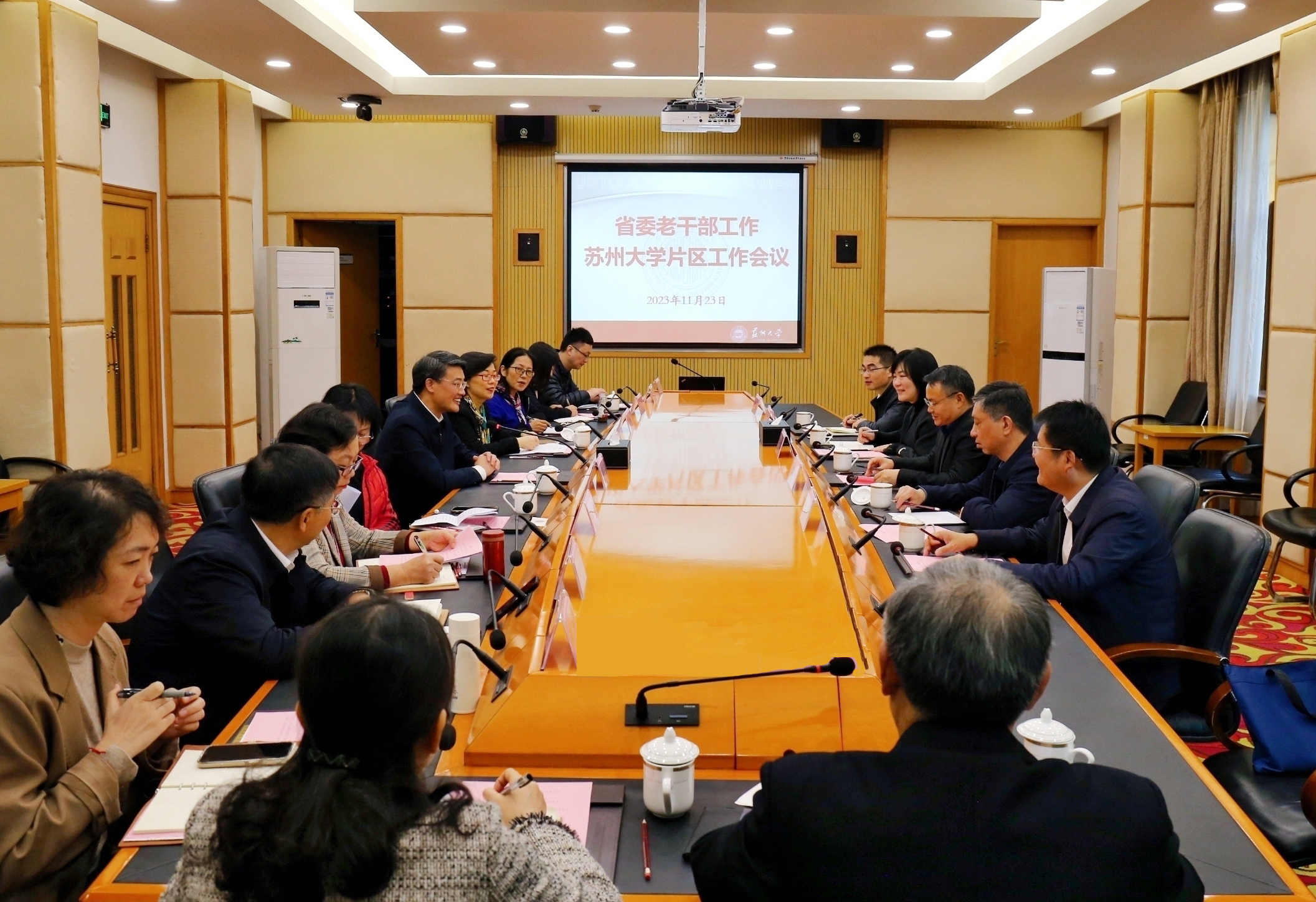 11月23日上午,省委老干部工作苏州大学片区工作会议在我校天赐庄校区红楼会议中心召开。省委老干部局副局长、机关党委书记刘芳琼一行参会指导,我校党委副书记邓敏出席会议并致辞。苏州大学片区8所高校的离退休工作负责人参加会议。会议由我校离退休党工委书记、离退休工作部(处)部(处)长陈彦艳主持。