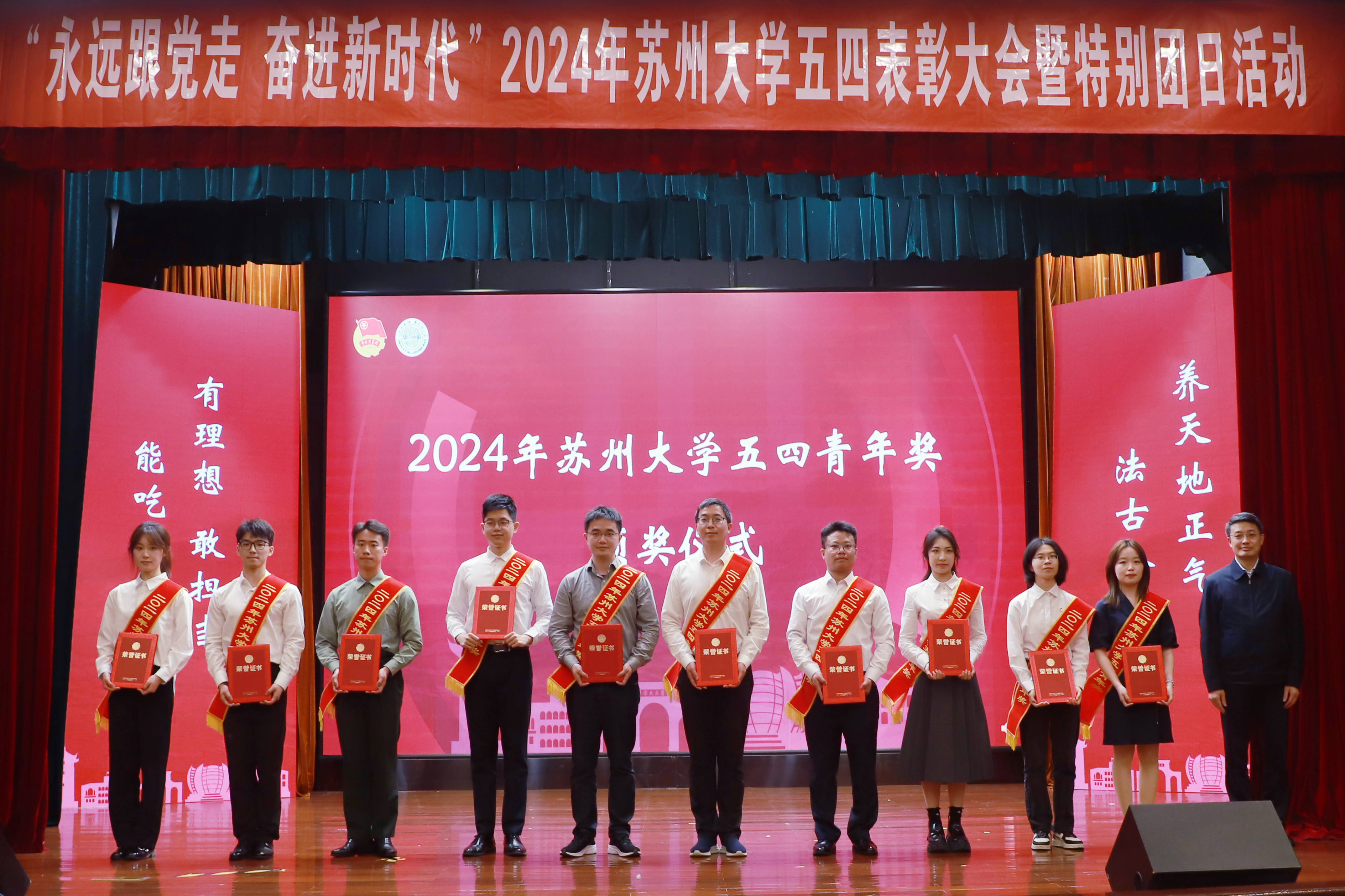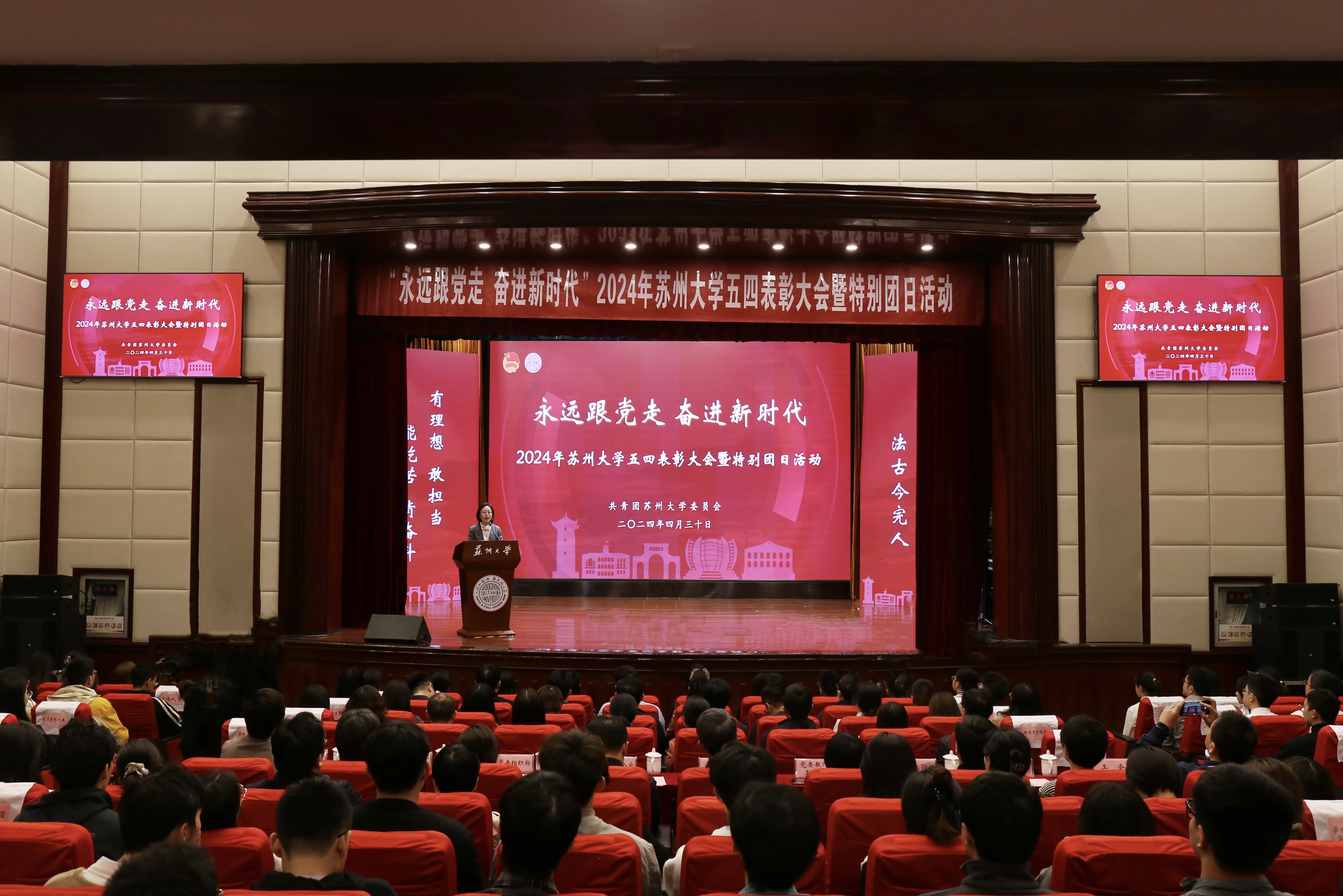 会上举行的“永远跟党走,奋进新时代”2024年苏州大学五四特别团日活动暨“信仰公开课”校级示范课,分为“新青年 永远跟党走”“恰风华 奋进新时代”“苏大人 启航向未来”三个篇章。2022年苏州大学五四青年奖获得者、教育学院2023级教育学硕士研究生尹佳主持活动。