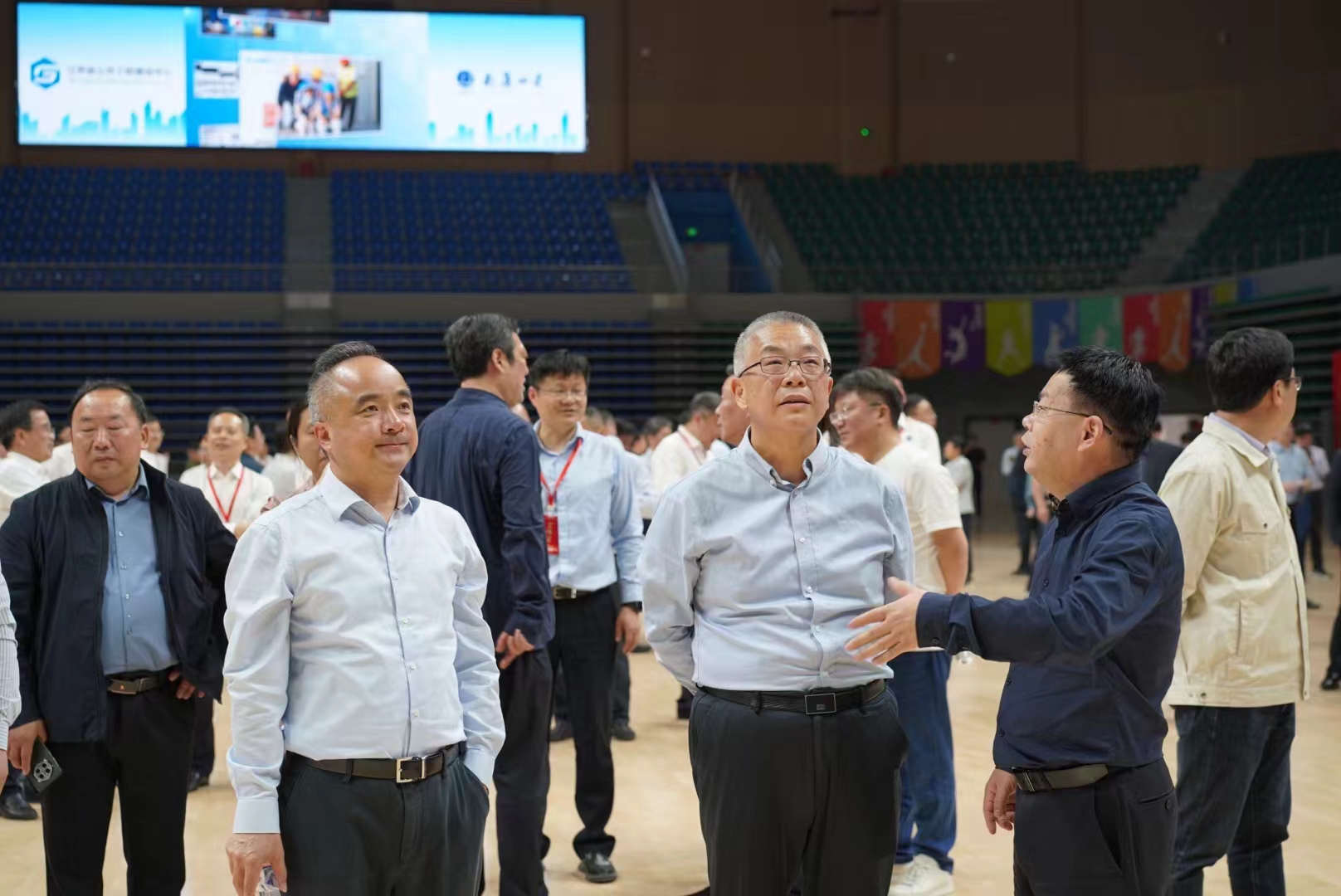 在项目现场,大家实地了解到,该项目在苏州市首次成功运用“网架液压同步顶升”的施工技术及节能减排落实,同时也听取了项目总体建设情况,实地参观了体育馆活动座椅的伸缩演示等。