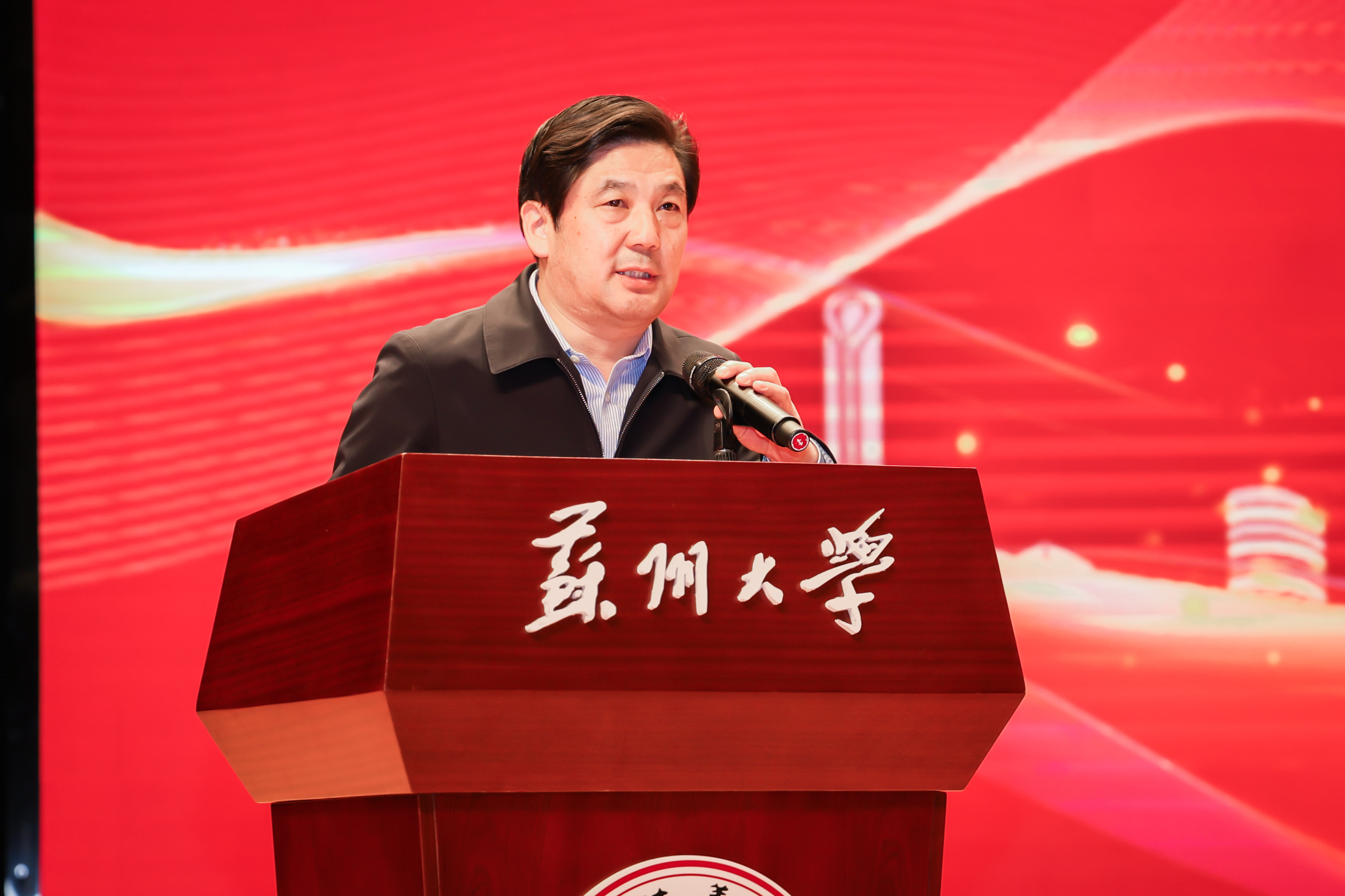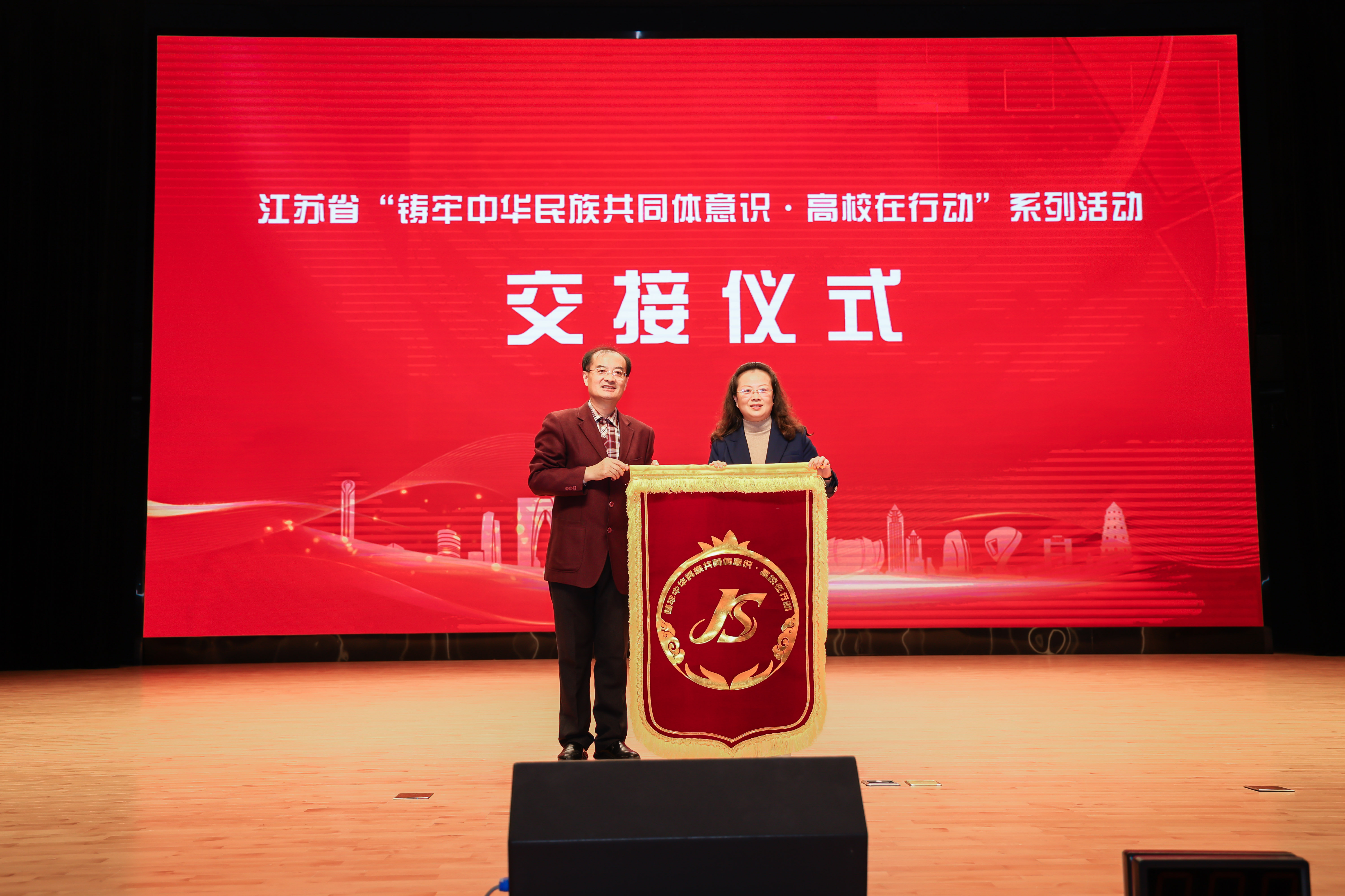 邓飞宣布第三届“铸牢中华民族共同体意识·高校在行动”承办高校为扬州大学。我校党委常委、统战部部长黄志斌和扬州大学统战部副部长毛瑞雪交接会旗。