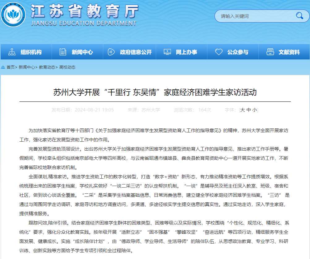 自2023年起,我校牵头江苏高校探索省际联合家访工作机制。为进一步强化家校共育,切实提升资助对象认定的精准性和资助育人工作的有效性,我校系统性谋划设计了本校家庭经济困难学生家访工作品牌“千里行·东吴情”家庭经济困难学生家访活动,打通家校共育“最后一公里”,获省教育厅官网报道。