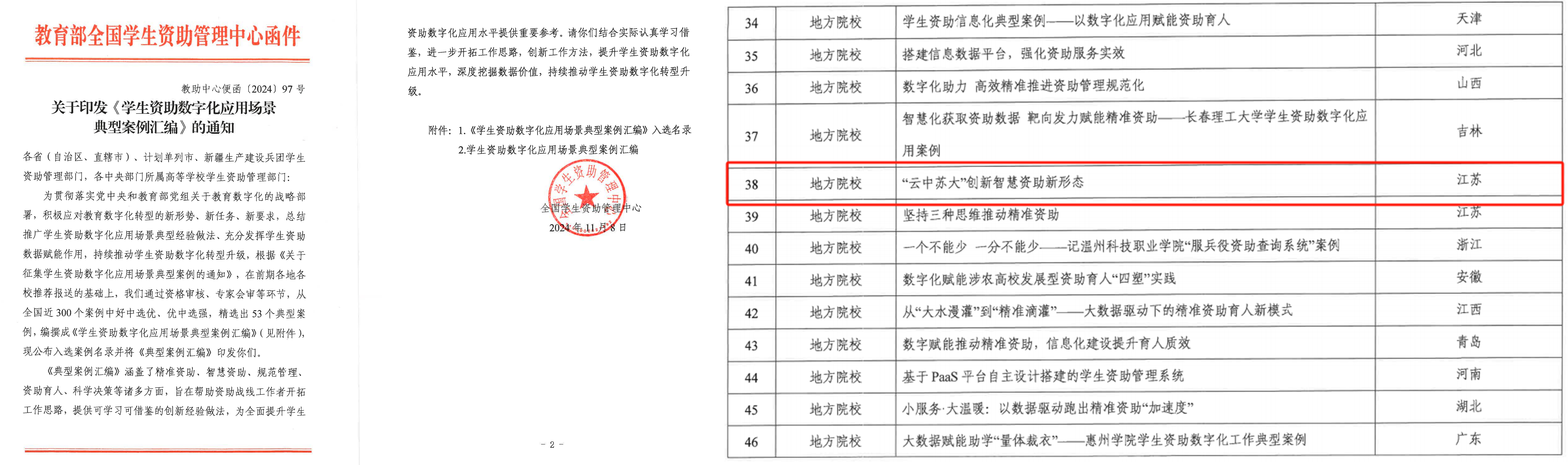 近日,教育部全国学生资助管理中心公布了《学生资助数字化应用场景典型案例汇报》入选案例名录,旨在贯彻党中央和教育部党组关于教育数字化的战略部署,宣传学生资助数字化应用场景典型做法,充分发挥学生资助数据赋能作用,推动学生资助数字化转型升级,推动新时代学生资助工作高质量发展。我校报送的《“云中苏大”创新智慧资助新形态》在全国近300个案例中脱颖而出,入围典型案例名录(全国仅53篇)。
