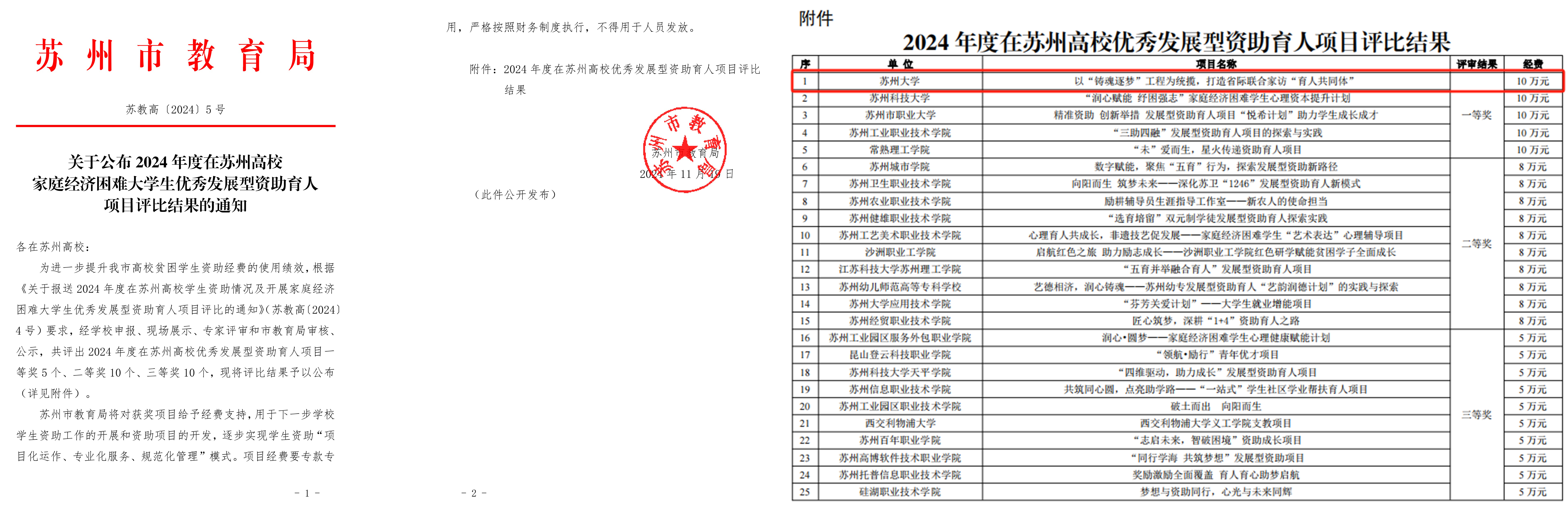 未来,我校将继续以本科生“铸魂逐梦”工程为统揽,落实“精准资助 资助育人”双重任务,精细服务每一位家庭经济困难学生全面发展、健康成长,积极构建具有苏大特色的发展型资助育人体系,以实干担当推动学校人才培养高质量发展。
