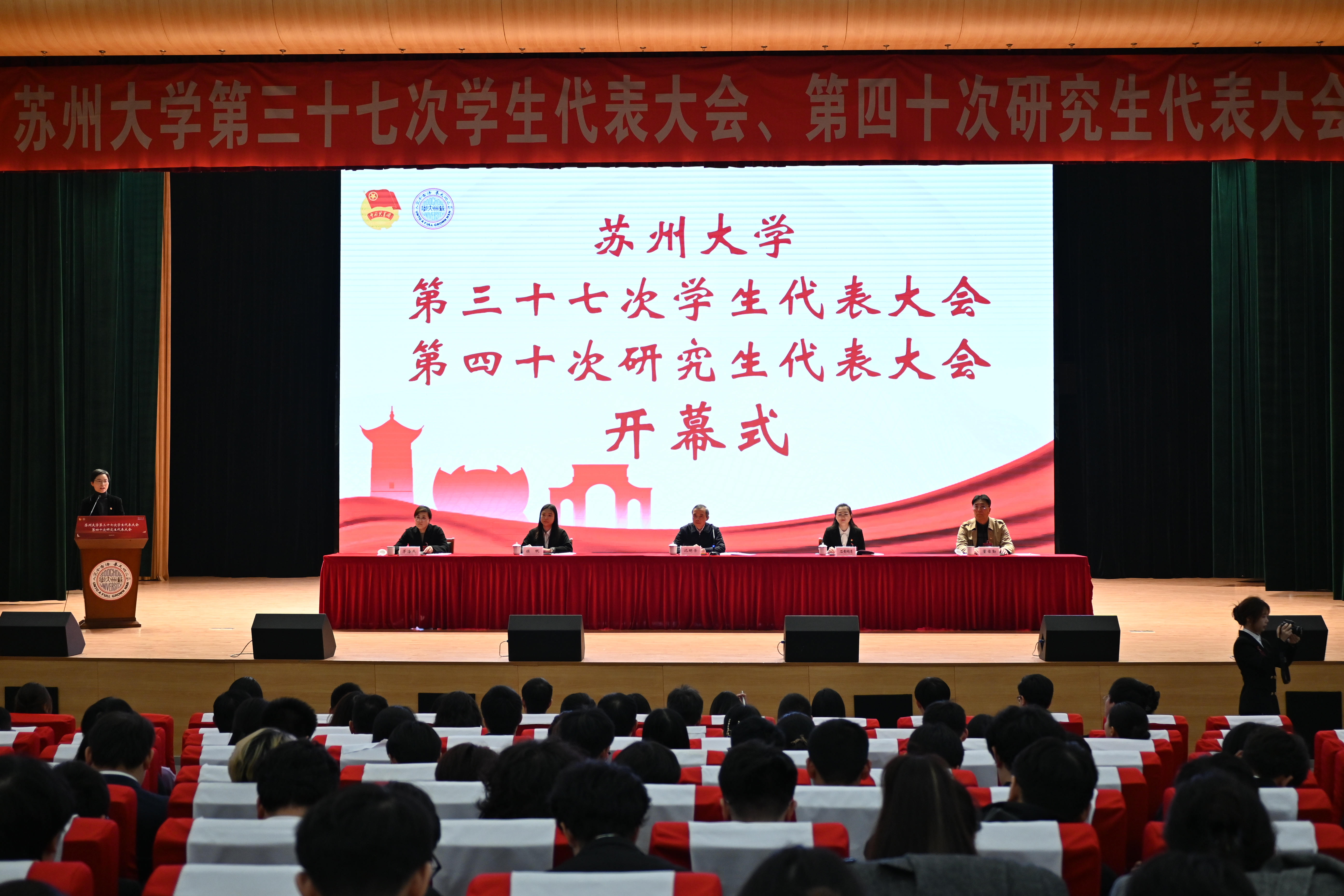 12月7日,苏州大学第三十七次学生代表大会、第四十次研究生代表大会在天赐庄校区存菊堂召开。校党委副书记、副校长沈明荣,省学生联合会驻会执行主席石黄闻清,市学生联合会驻会执行主席顾帆,党委学生工作部(处)部(处)长董召勤,党委研究生工作部部长茅海燕,以及各学院(部)学生会、研究生会秘书长出席开幕式。267名本科生代表和185名研究生代表参加大会。开幕式由团委书记于潜驰主持。