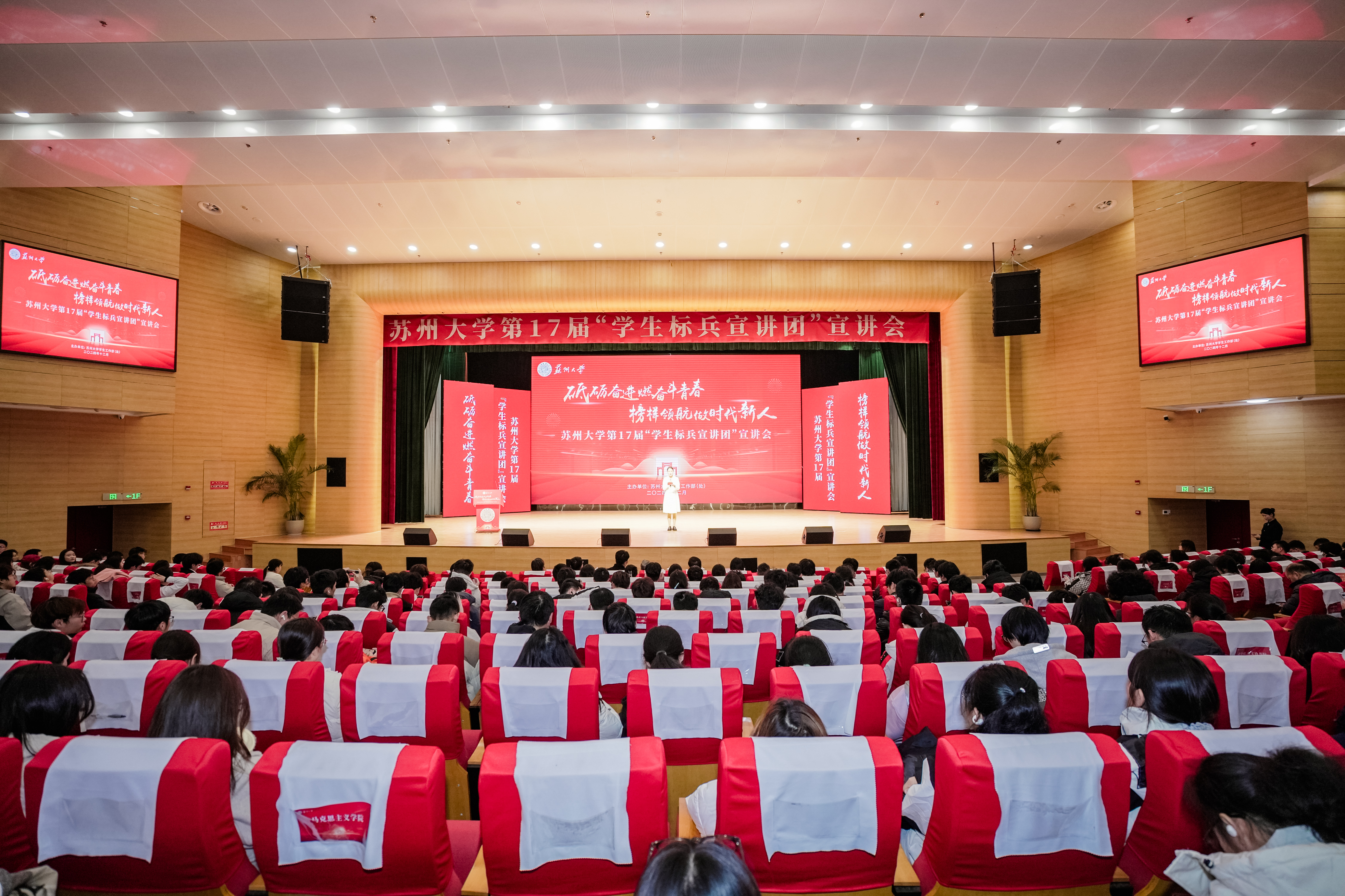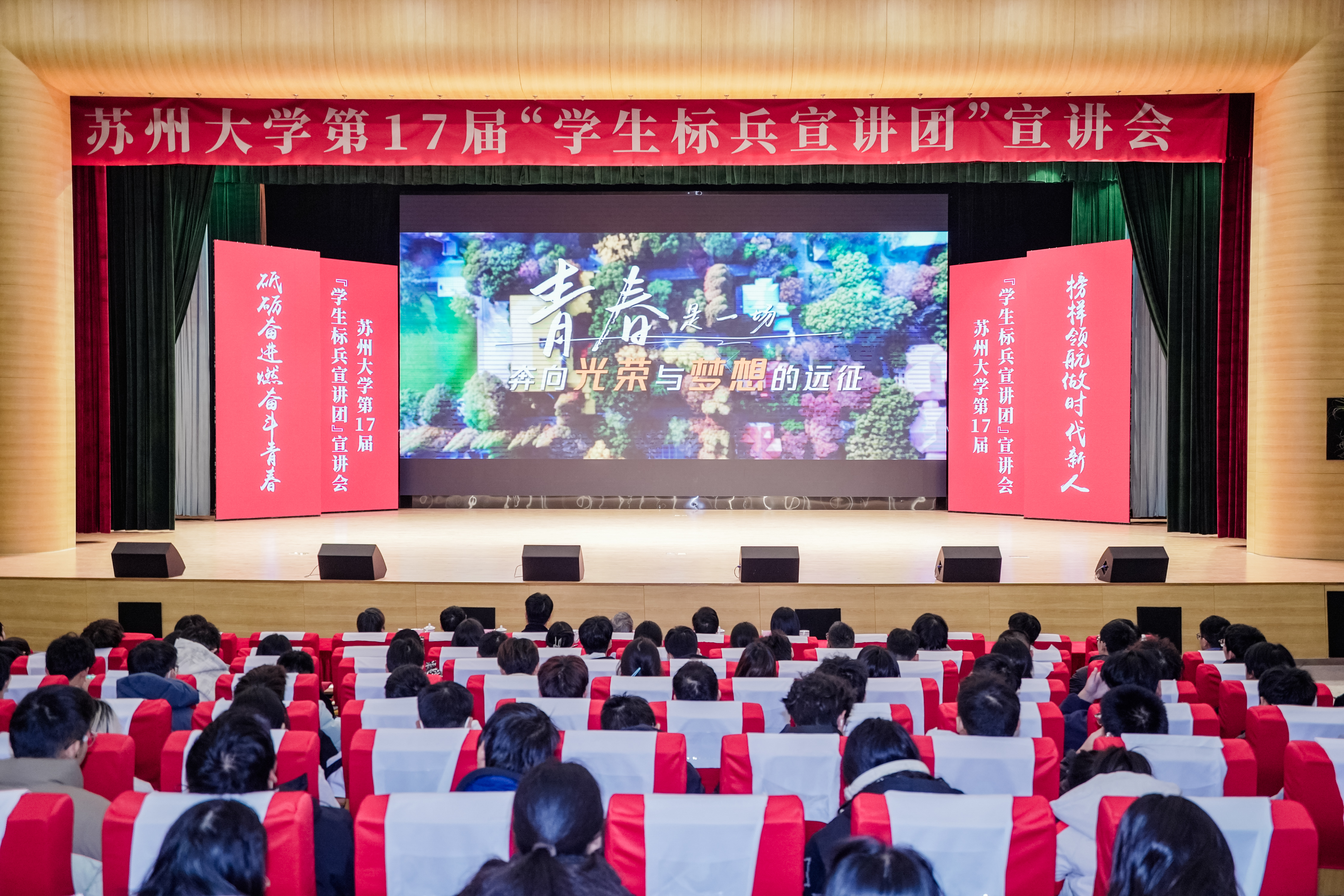 为深入学习贯彻习近平新时代中国特色社会主义思想,深入推进“铸魂逐梦”工程,12月11日下午,砥砺前行燃奋斗青春,榜样领航做时代新人——苏州大学第17届“学生标兵宣讲团”宣讲会在天赐庄校区存菊堂举行。校党委副书记、副校长沈明荣出席会议,相关职能部门负责人,各学院(部)分管本科学生工作领导、学生工作办公室主任、2024级本科生辅导员和2024级本科生代表参加会议。