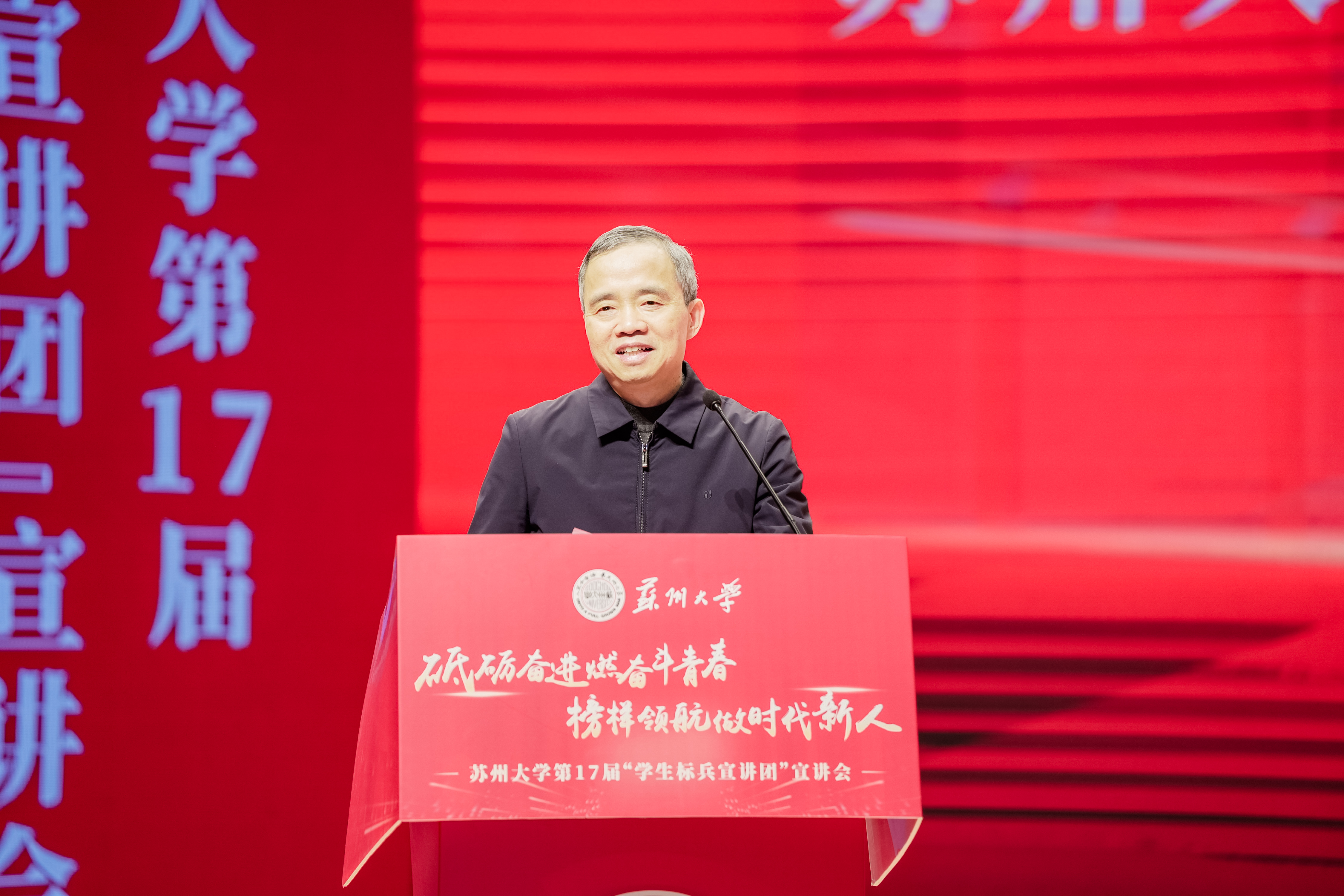 党委学生工作部(处)部(处)长董召勤宣读苏州大学第17届“学生标兵宣讲团”成员名单。沈明荣为十二位学生标兵颁发荣誉证书和奖杯。
