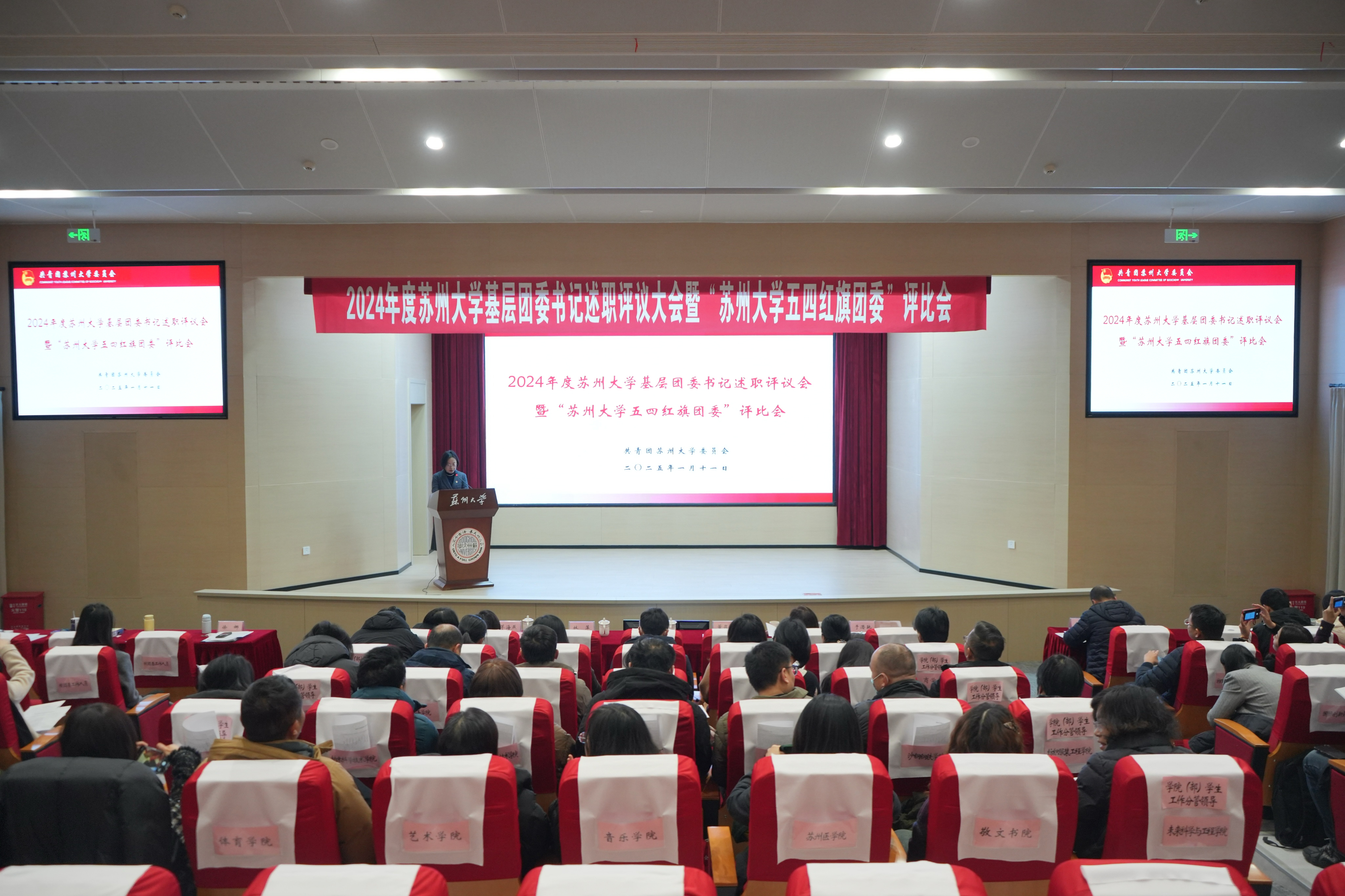 1月11日,我校2024年度基层团委书记述职评议会暨“苏州大学五四红旗团委”评比会在天赐庄校区红楼学术报告厅举行。校党委副书记、副校长沈明荣出席会议,相关职能部门负责人,各学院(部)分管学生工作负责人,基层团组织负责人,校团委全体工作人员和青年代表参加会议。会议由校团委副书记徐娜主持。
