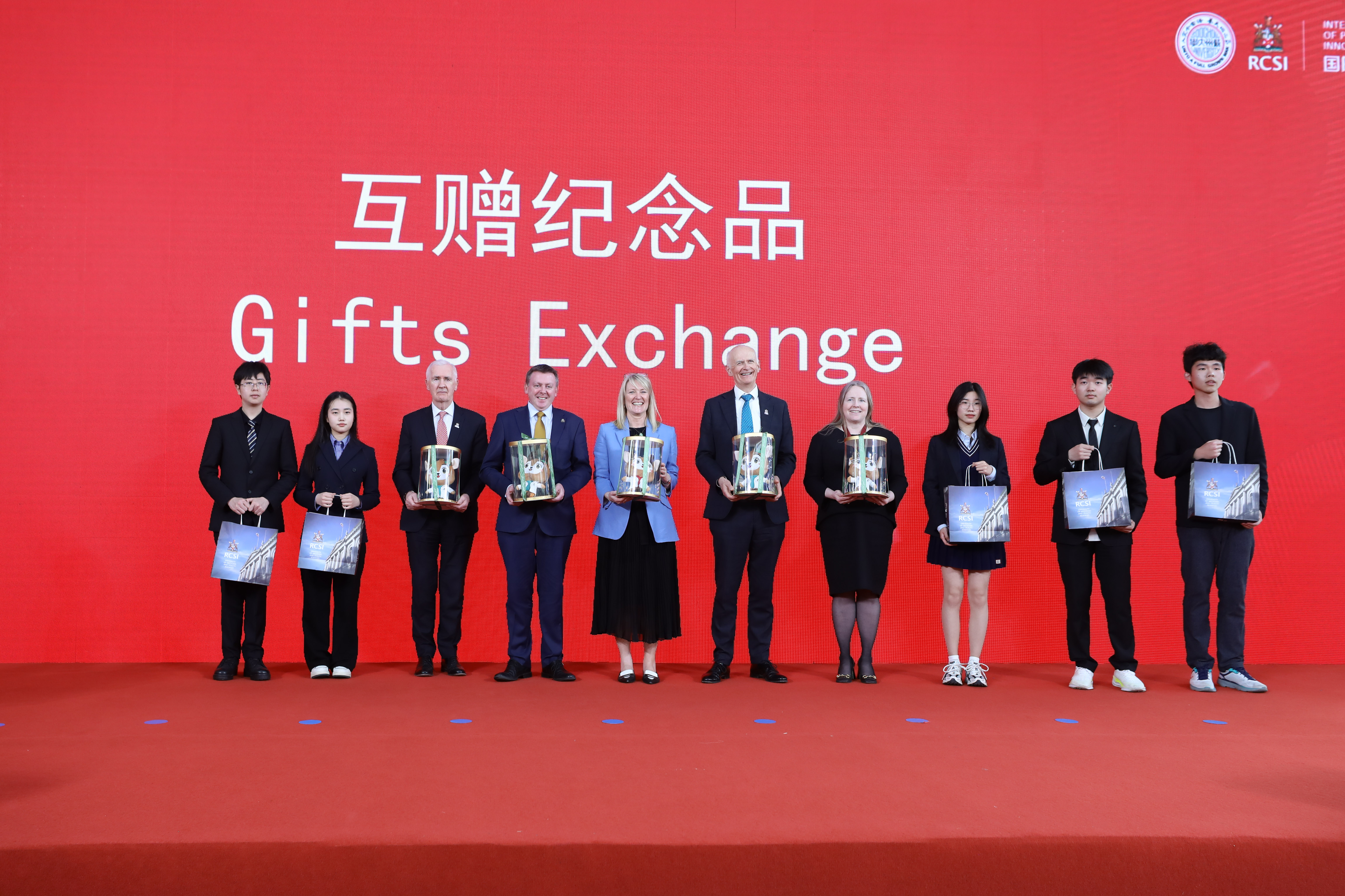 国际创新药学院学生代表与爱尔兰皇家外科医学院代表互赠纪念品。