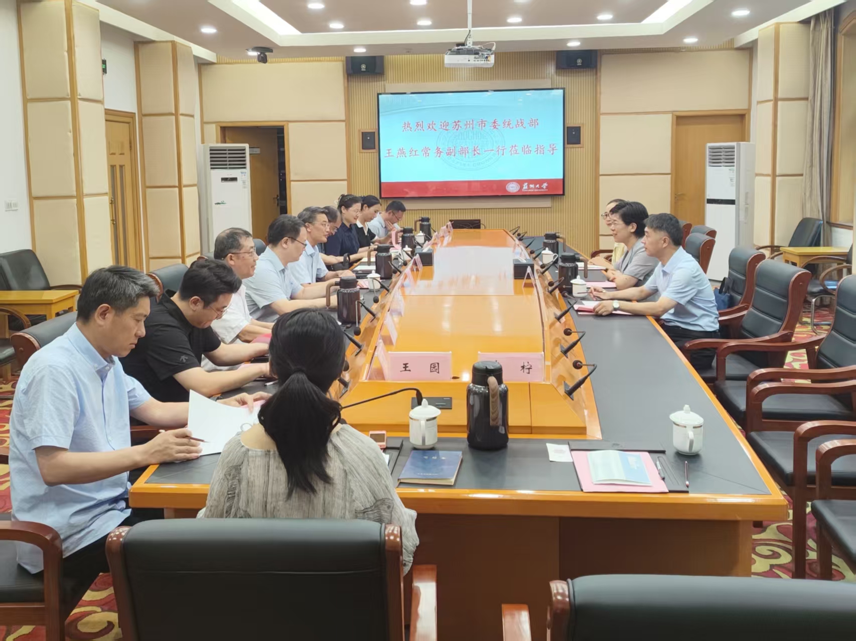 8月1日下午,苏州市委统战部常务副部长王燕红一行来校调研,校党委副书记邓敏出席并主持调研座谈会。市委统战部副部长黄志勇,市委统战部宣传处处长瞿唅晔,校党委常委、统战部部长黄志斌,民进苏大委员会主委刘庄,民进苏大委员会班子成员及会员代表参加座谈会。