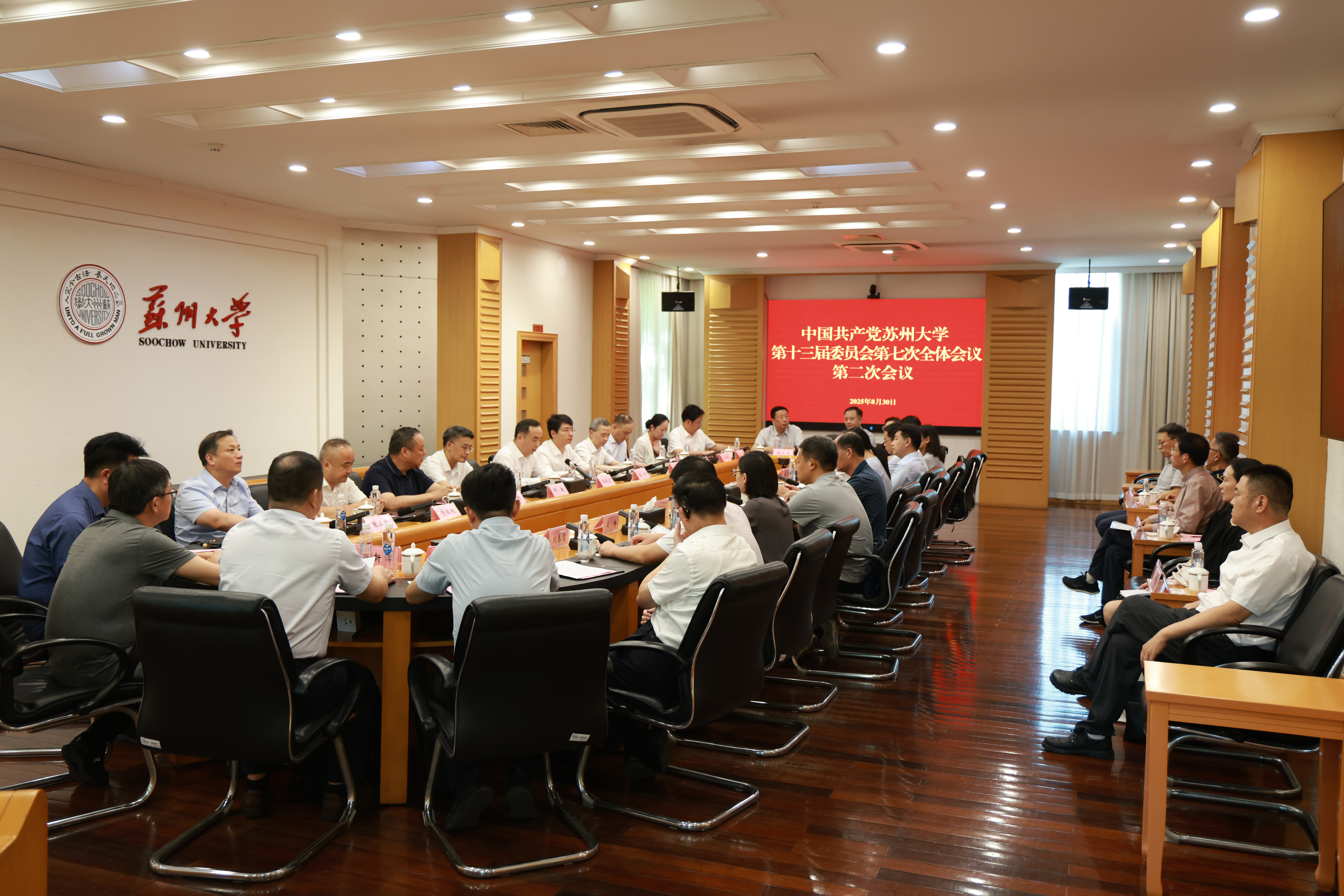 8月30日,中国共产党苏州大学第十三届委员会第七次全体会议及全校干部大会召开。校领导班子成员,校级老同志(正校级老同志、近三年退下来的副校级老同志),校党委委员、校纪委委员,院士,全校在职副处职及以上干部(含聘任制干部),省级及以上党代表、人大代表、政协委员,校各民主党派主要负责人,离退休党委委员、退协正副理事长,校学术委员会委员,校学位评定委员会委员,校级科研机构主要负责人参加会议。
