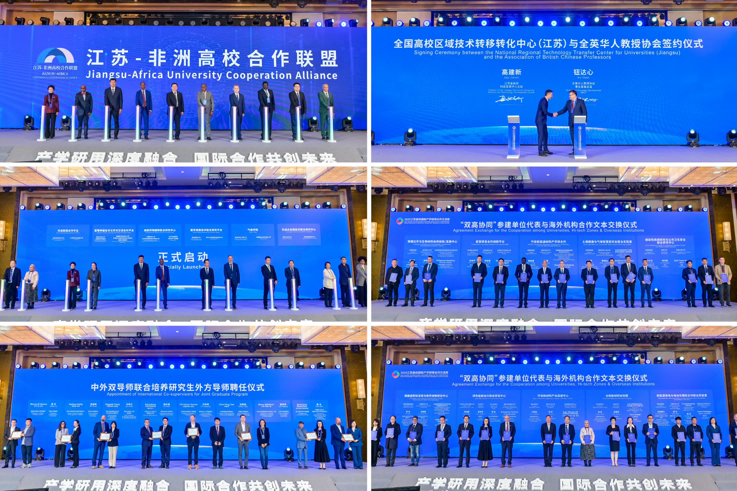 开幕式现场举行了江苏—非洲高校联盟成立仪式,发布了江苏高校国际产学研用十大合作成果。南京航空航天大学、南京农业大学等江苏高校与土耳其、美国等国外高校和企业签署了6项国际产学研用合作平台协议。东南大学、南京林业大学等8所高校现场聘任了一批中外双导师联合培养研究生外方导师。全国高校区域技术转移转化中心(江苏)与全英华人教授协会签署了合作备忘录。南京理工大学、苏州大学等高校与江阴高新区、苏州高新区等高新区,以及法国国家健康与医学研究院等海外机构签署了10个三方合作协议。