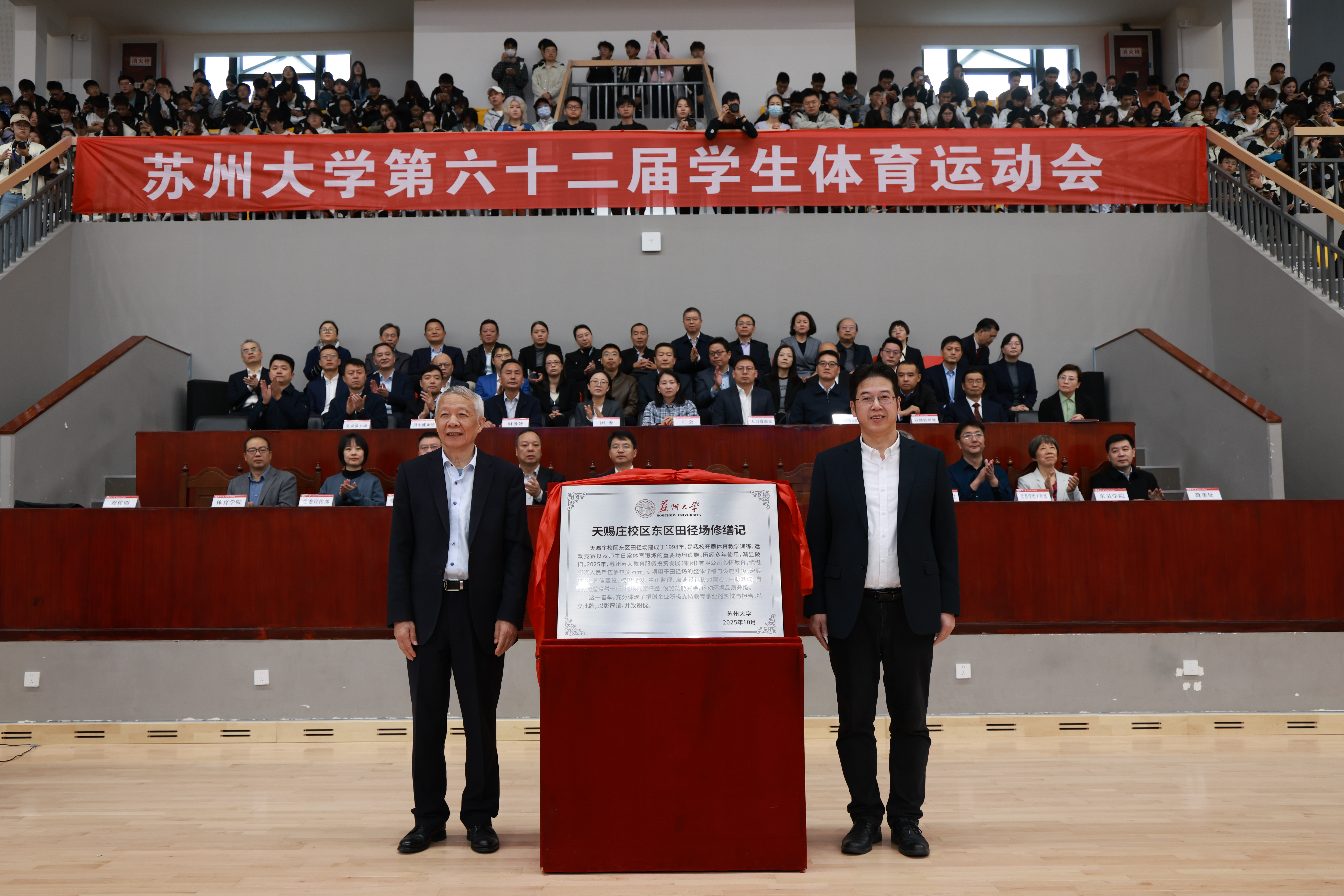 今年,苏州苏大教育服务投资发展(集团)有限公司捐资,专项用于田径场的整体修缮与设施升级。现场,韦曙和、王云杰为东区田径场捐赠纪念铭牌揭牌。