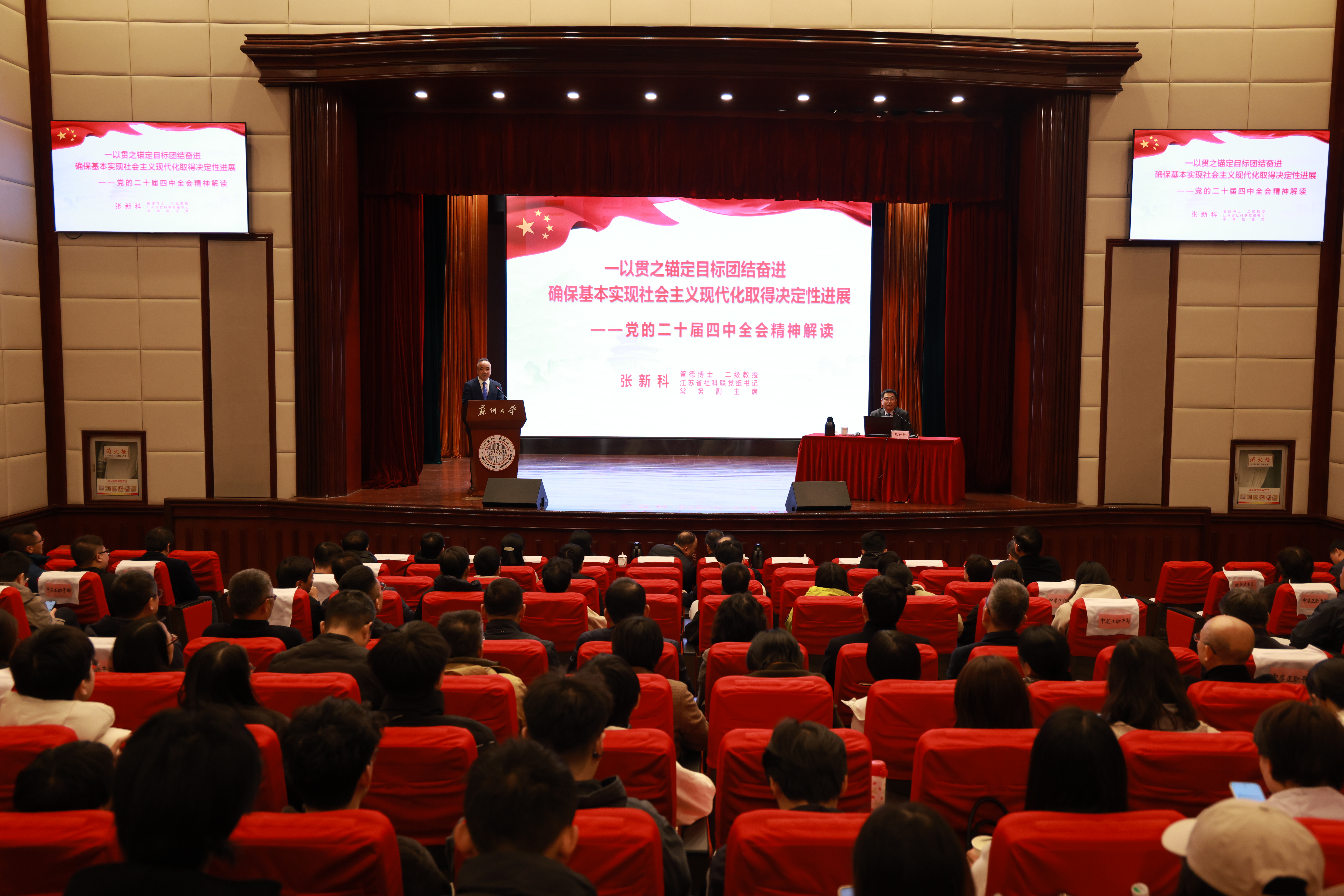 11月18日,学习贯彻党的二十届四中全会精神省委宣讲团报告会在我校天赐庄校区举行。省委宣讲团成员、省社科联党组书记、常务副主席张新科作宣讲报告。校领导、校党委理论学习中心组成员、校党委委员、纪委委员、中层正职干部、思政课教师、专职辅导员代表和学生代表等参加报告会。会议由我校党委常委、副校长查佐明主持。