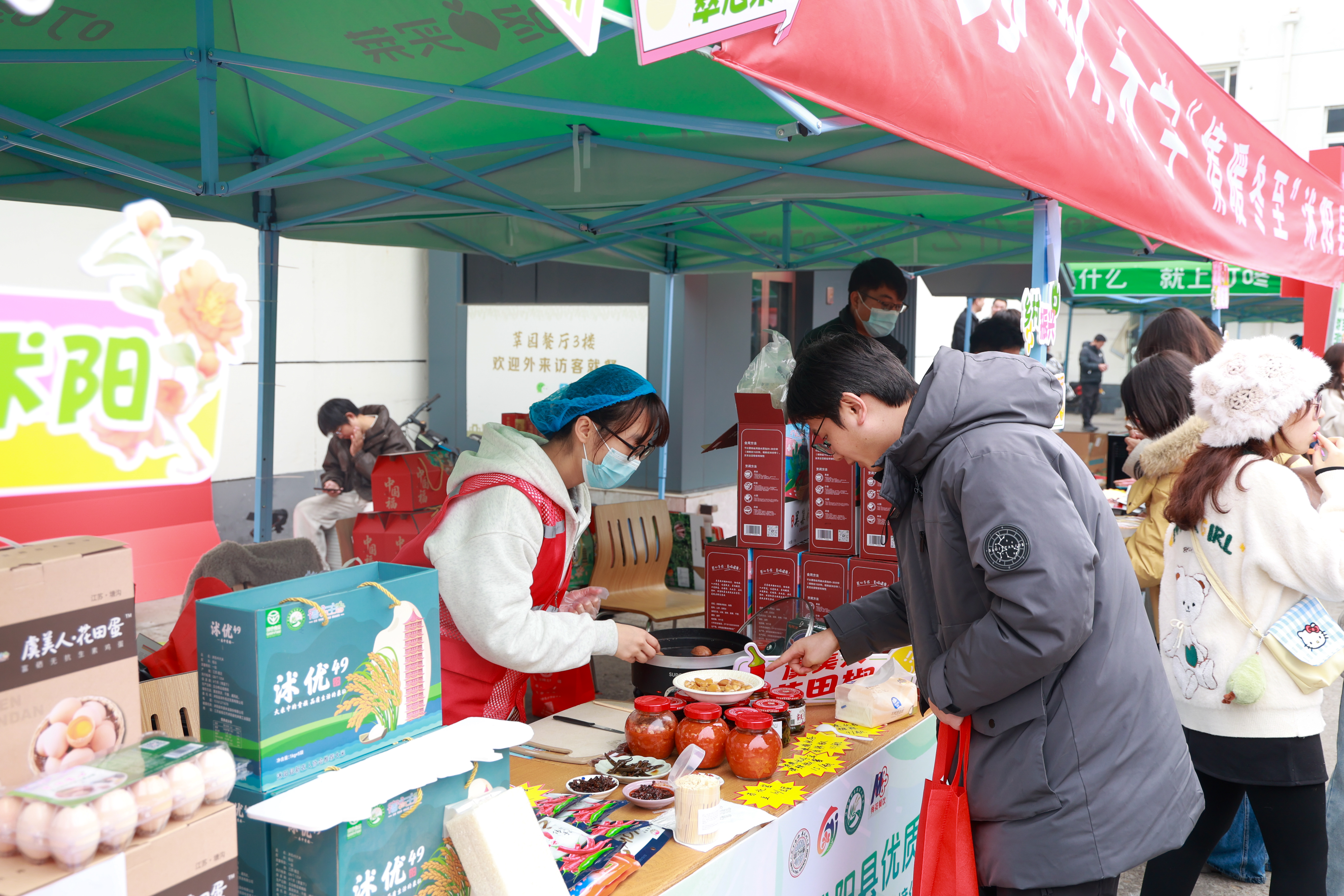 值得一提的是,今年学校特设冬至市集,烘焙蛋糕、时令水果、特色饮品、进口商品、手作美食五大专区免费品尝,尽享舌尖上的幸福。另外,沭阳农产品展销活动也走进校园,为师生提供了丰富的农副产品选择。