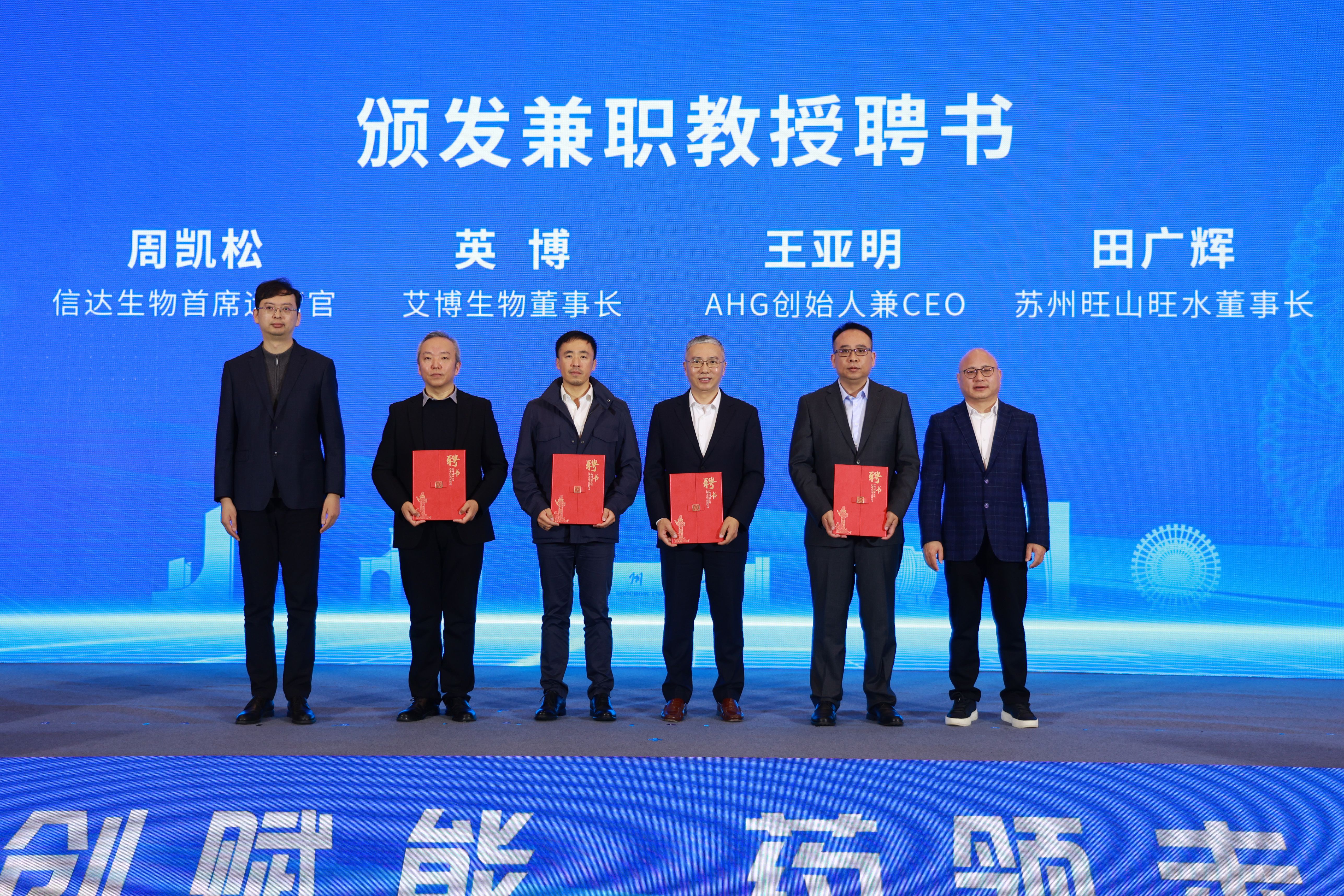 为推动产学研深度融合,大会举行了多项聘任与签约仪式,展现了务实合作的丰硕成果。信达生物首席运营官周凯松、艾博生物董事长英博、AHG创始人兼CEO王亚明、苏州旺山旺水董事长田广辉受聘为苏州创新药研究院兼职教授,助力构建和完善校企协同育人体系。