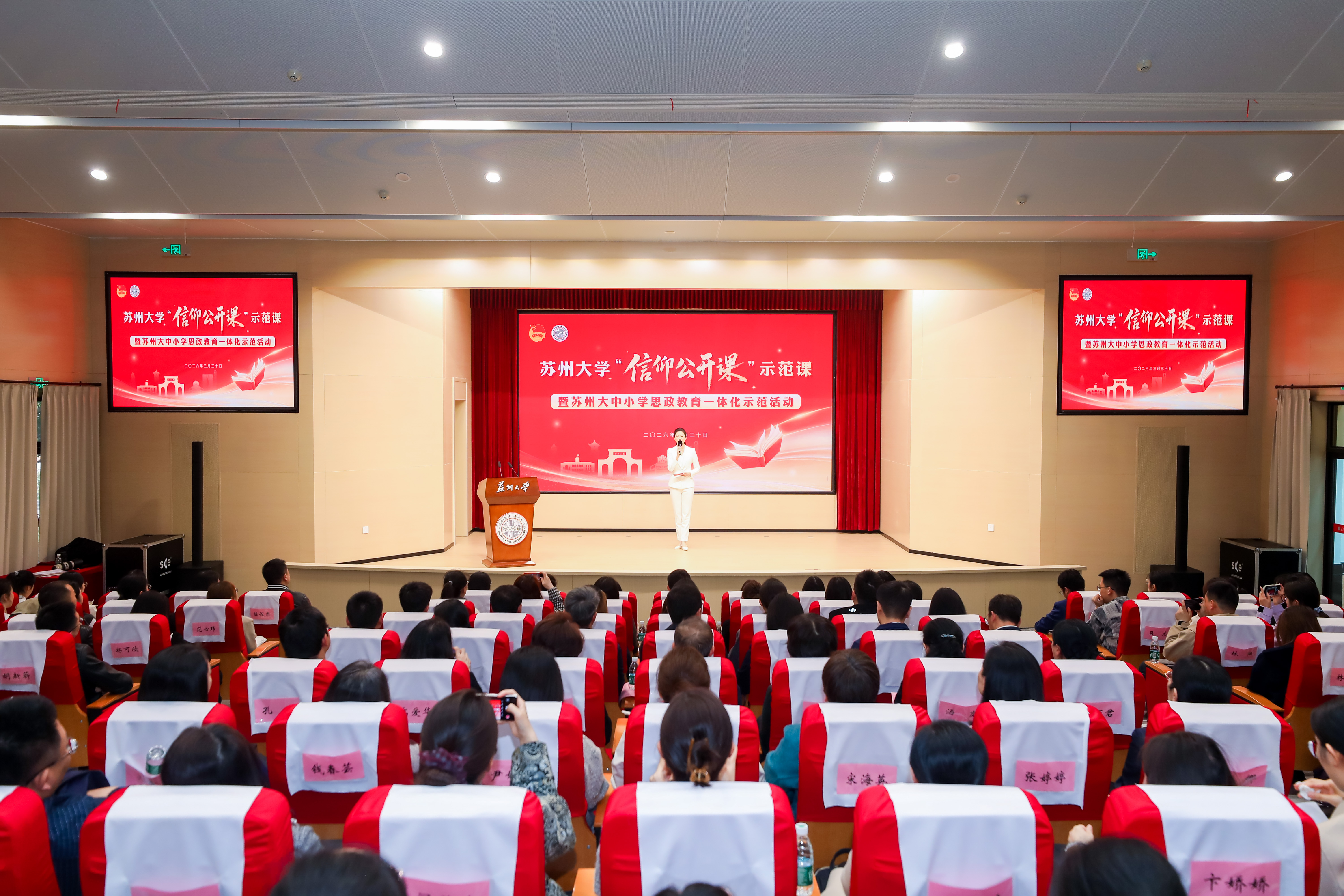 3月30日,我校举办“信仰公开课”示范课暨苏州大中小学思政教育一体化示范活动。该活动是由团省委组织,我校团委、马克思主义学院和团苏州市委承办的大中小学思政教育一体化示范活动。现场,大、中、小三个学段的老师同台讲述、共答时代命题。团省委副书记李晓明,我校党委副书记邓敏出席活动。来自全省各设区市团委、苏南片区高校团委、苏州县市区团委、苏州市属高校团委和苏州大中小学思政教育一体化团队工作联盟单位的负责同志等180余人齐聚一堂,共学共进。