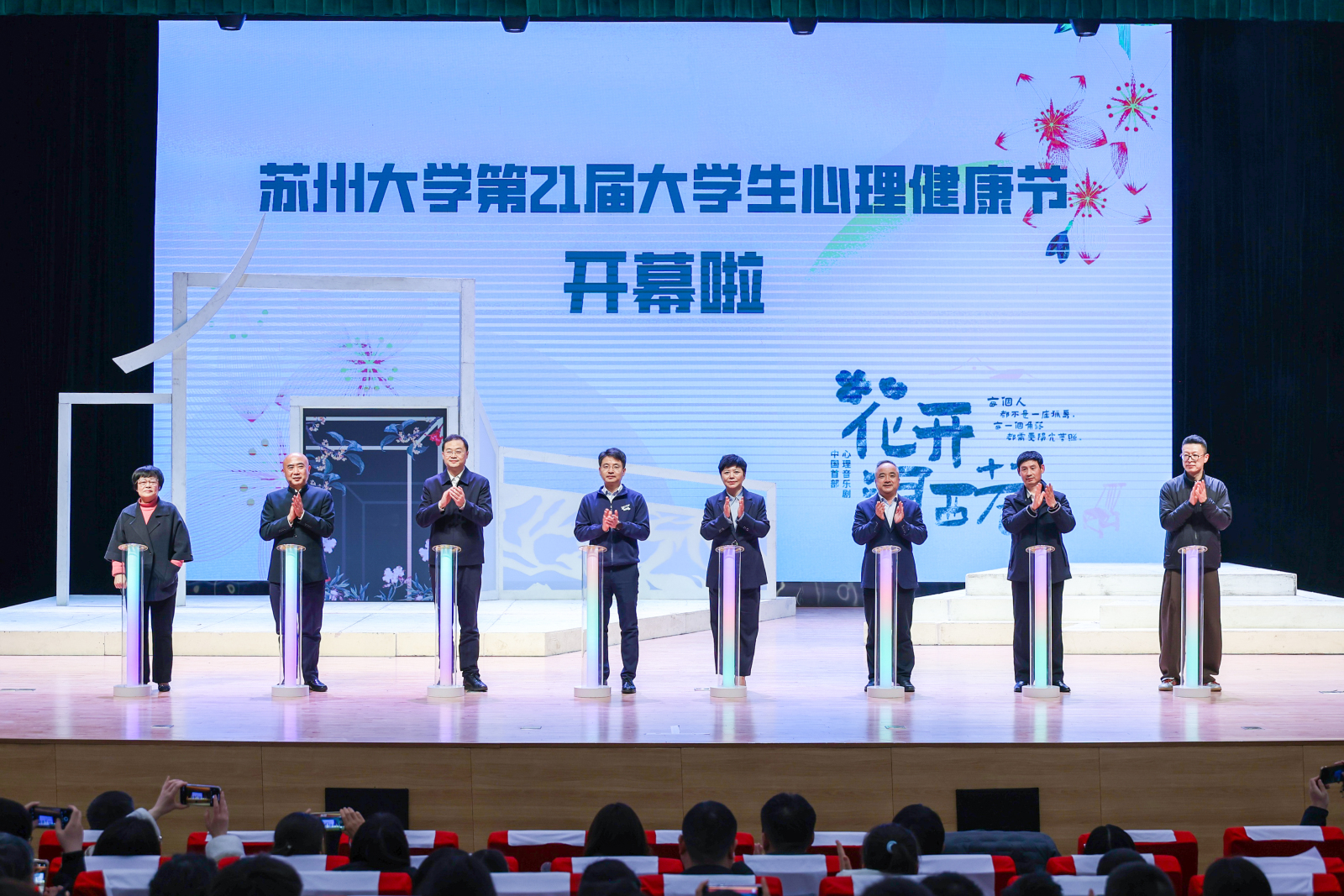 与会嘉宾共同按下启动键,点亮象征关怀与希望的绚烂光幕,苏州大学第二十一届大学生心理健康节正式开幕。