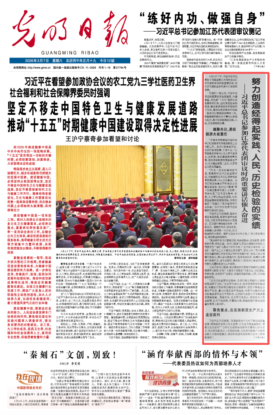 “习近平总书记在谈到发展新质生产力时强调要一体推进教育科技人才发展,为我们高校做好‘十五五’创新大文章指明方向。”现场聆听了习近平总书记的重要讲话,苏州大学党委书记张晓宏代表倍感振奋。