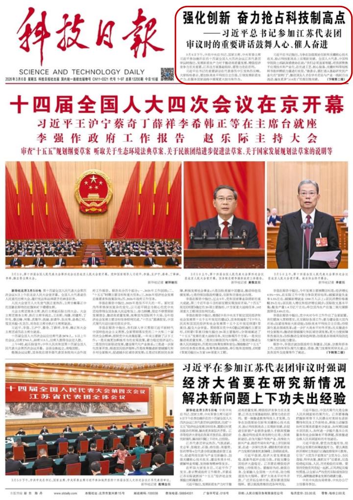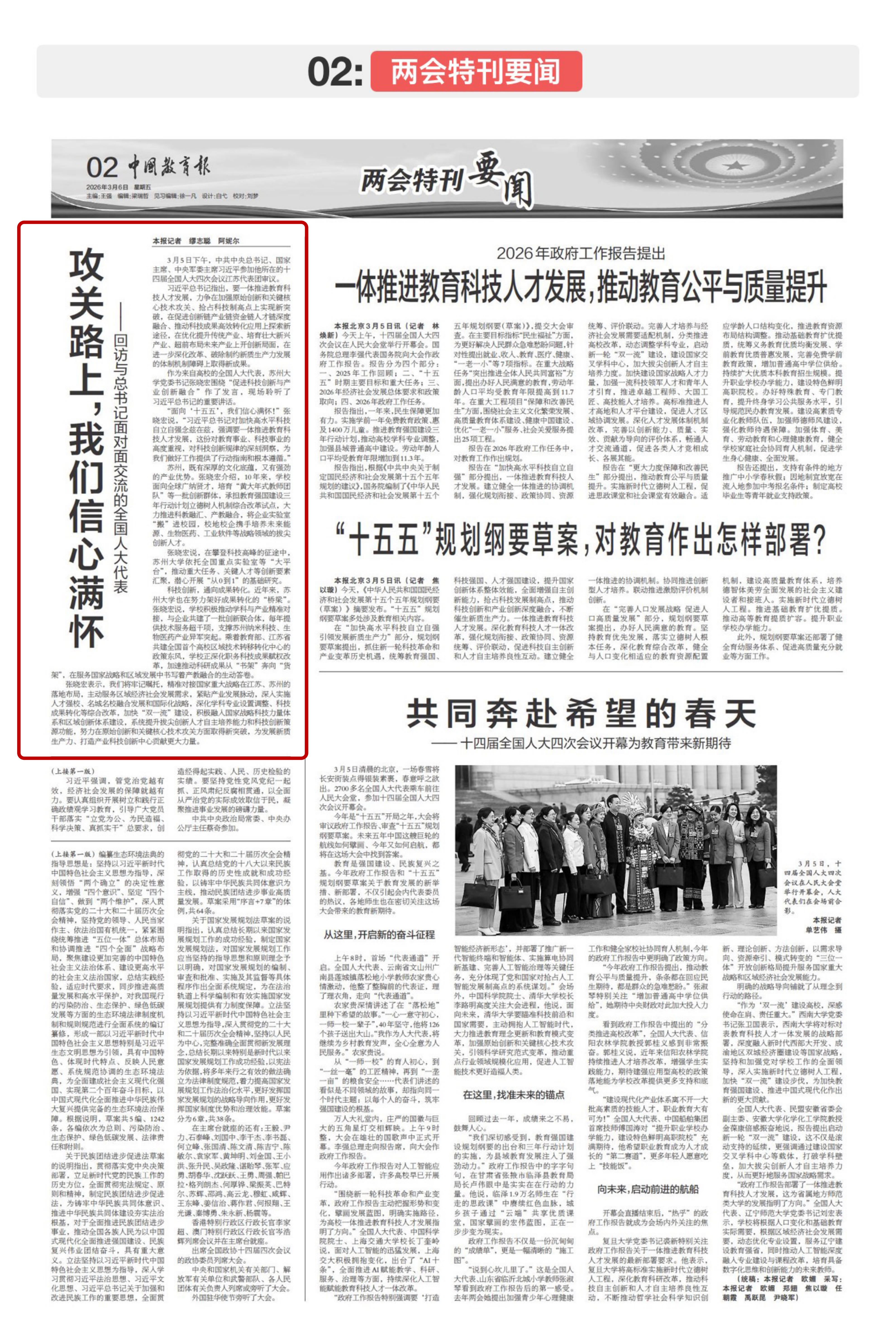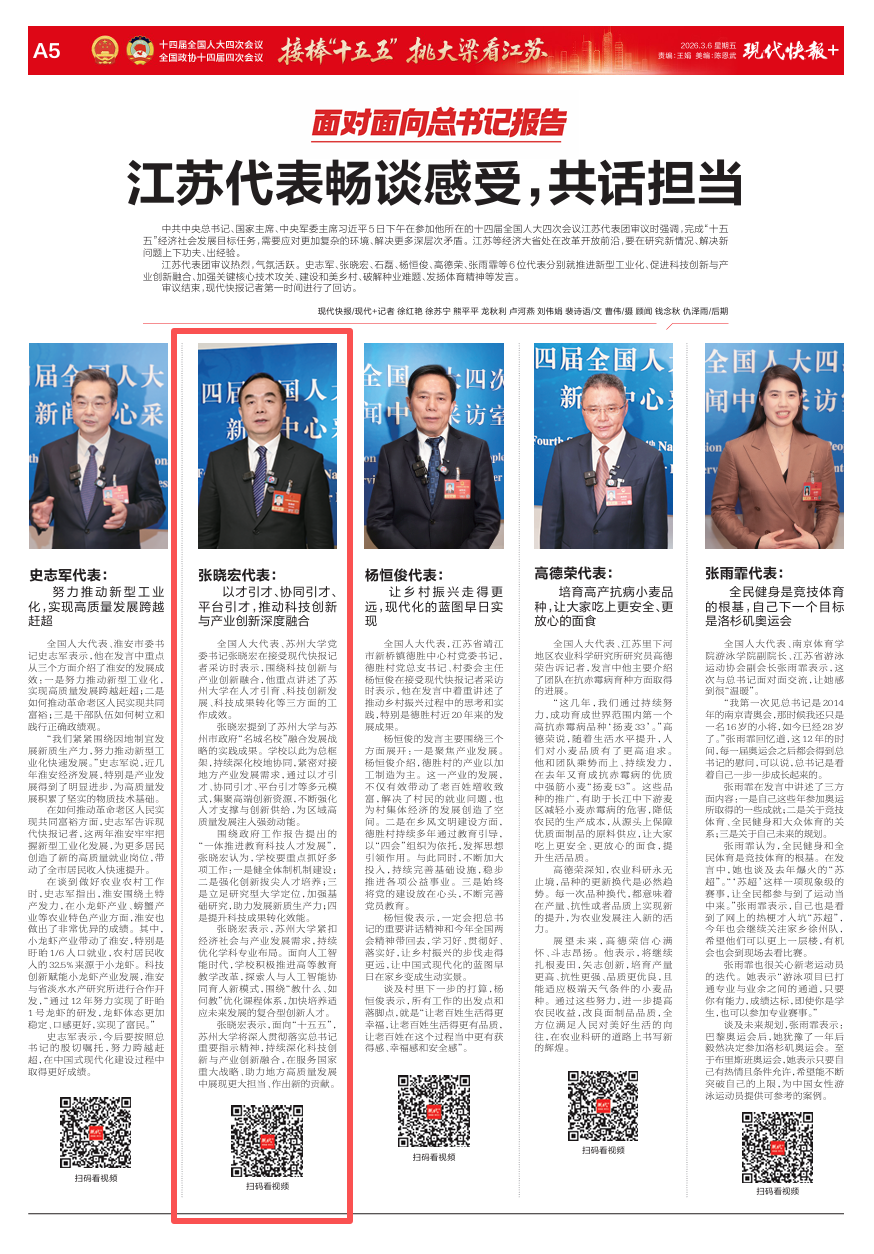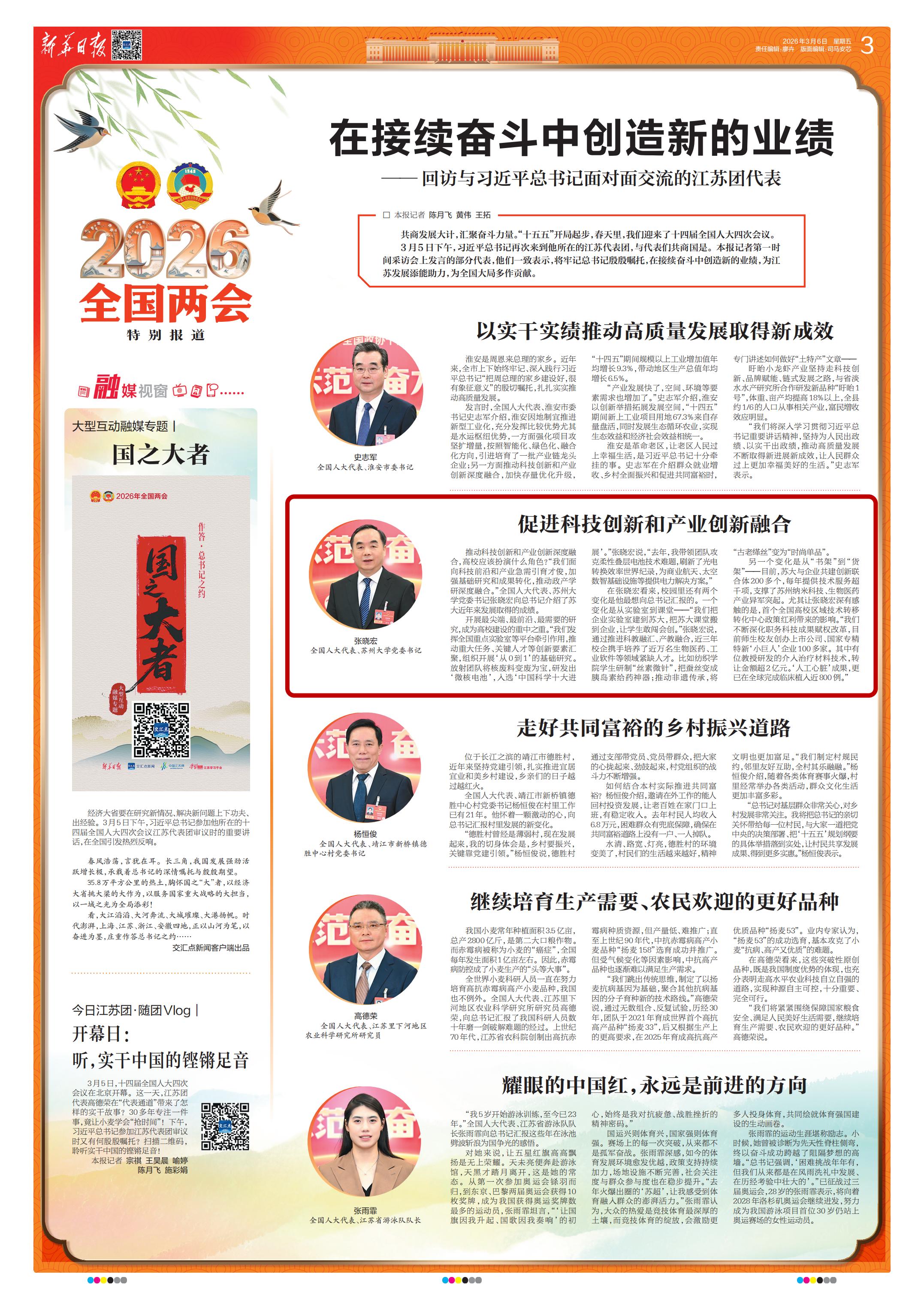 “作为一名来自高校的代表,现场聆听总书记的重要讲话,当面向总书记汇报学校改革发展成果,内心无比激动。”全国人大代表、苏州大学党委书记张晓宏说,总书记对加快高水平科技自立自强念兹在兹,在讲话中强调要一体推进教育科技人才发展,充分体现了总书记对教育事业、科技事业的高度重视,对科技创新规律的深刻洞察,为我们做好工作提供了行动指南和根本遵循。面向“十五五”,我们信心满怀。我们将牢记嘱托、感恩奋进,精准对接国家重大战略在江苏、苏州的落地布局,主动服务区域经济社会发展需求,紧贴产业发展脉动,深入实施人才强校、名城名校融合发展和国际化战略,深化学科专业设置调整、科技成果转化等综合改革,加快“双一流”建设,积极融入国家战略科技力量体系和区域创新体系建设,系统提升拔尖创新人才自主培养能力和科技创新策源功能,努力在原始创新和关键核心技术攻关方面取得新突破,为发展新质生产力、打造产业科技创新中心贡献更大力量。
