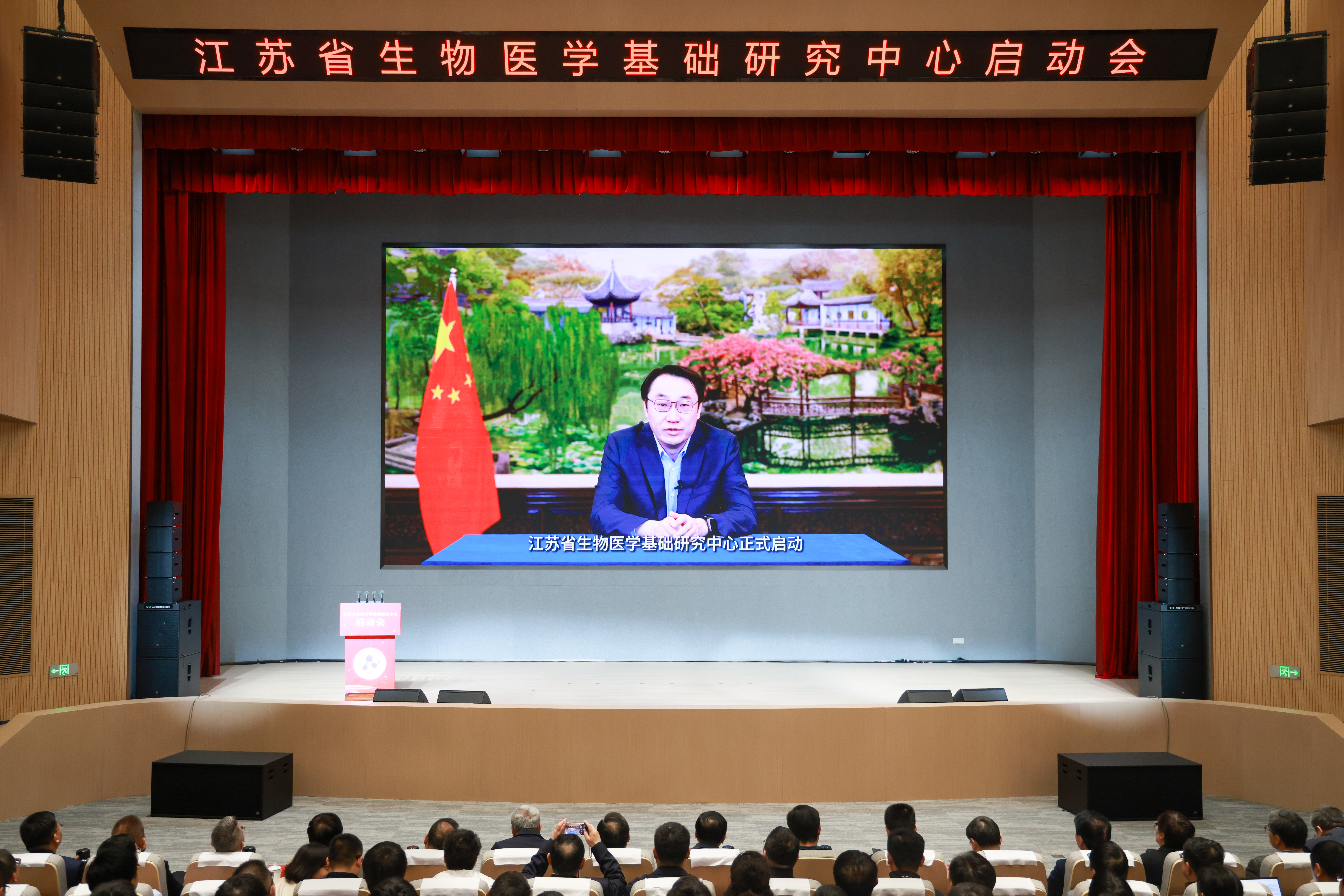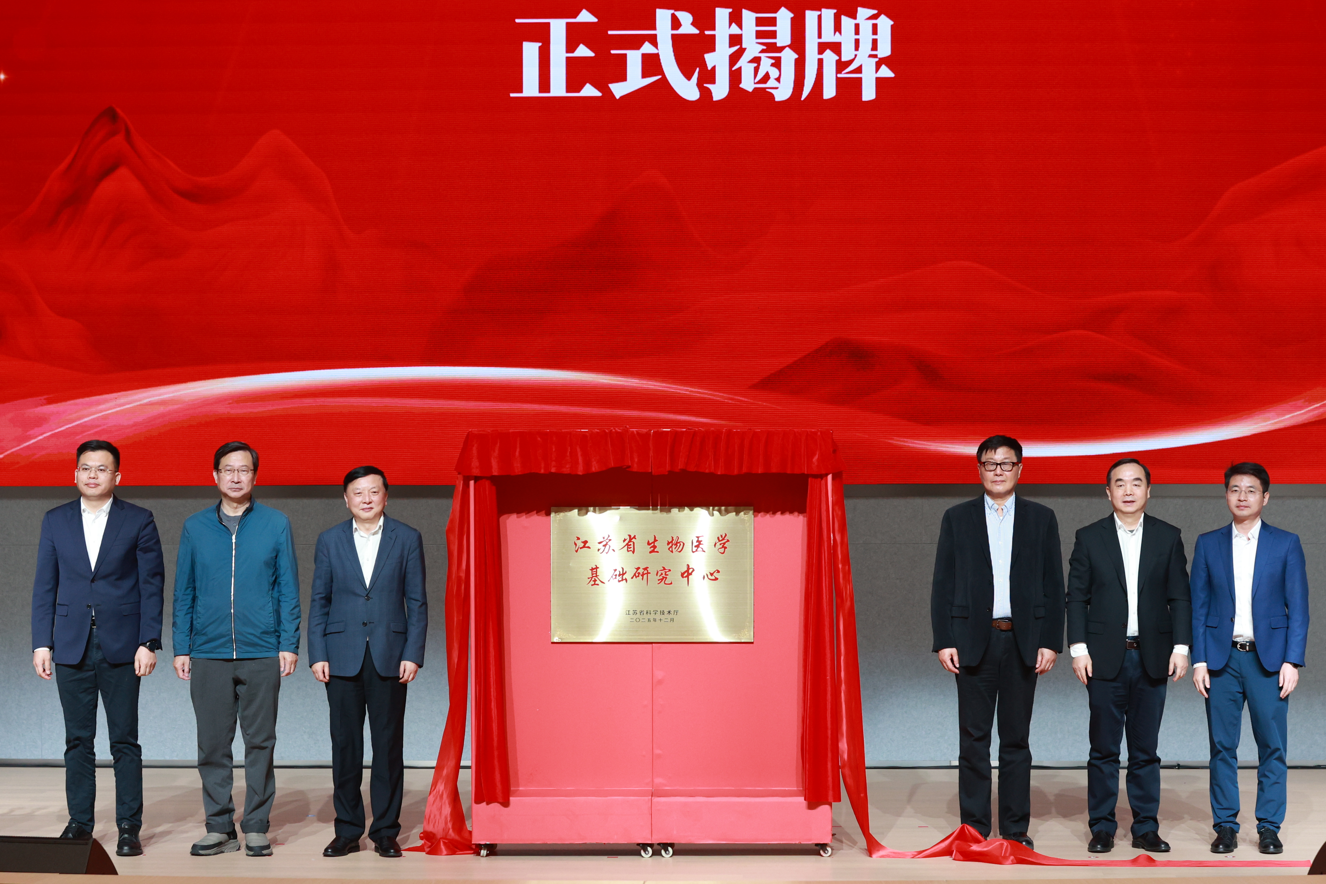 徐光辉、饶毅、王志新、张晓宏、徐积明、张桥共同为“江苏省生物医学基础研究中心”揭牌。
