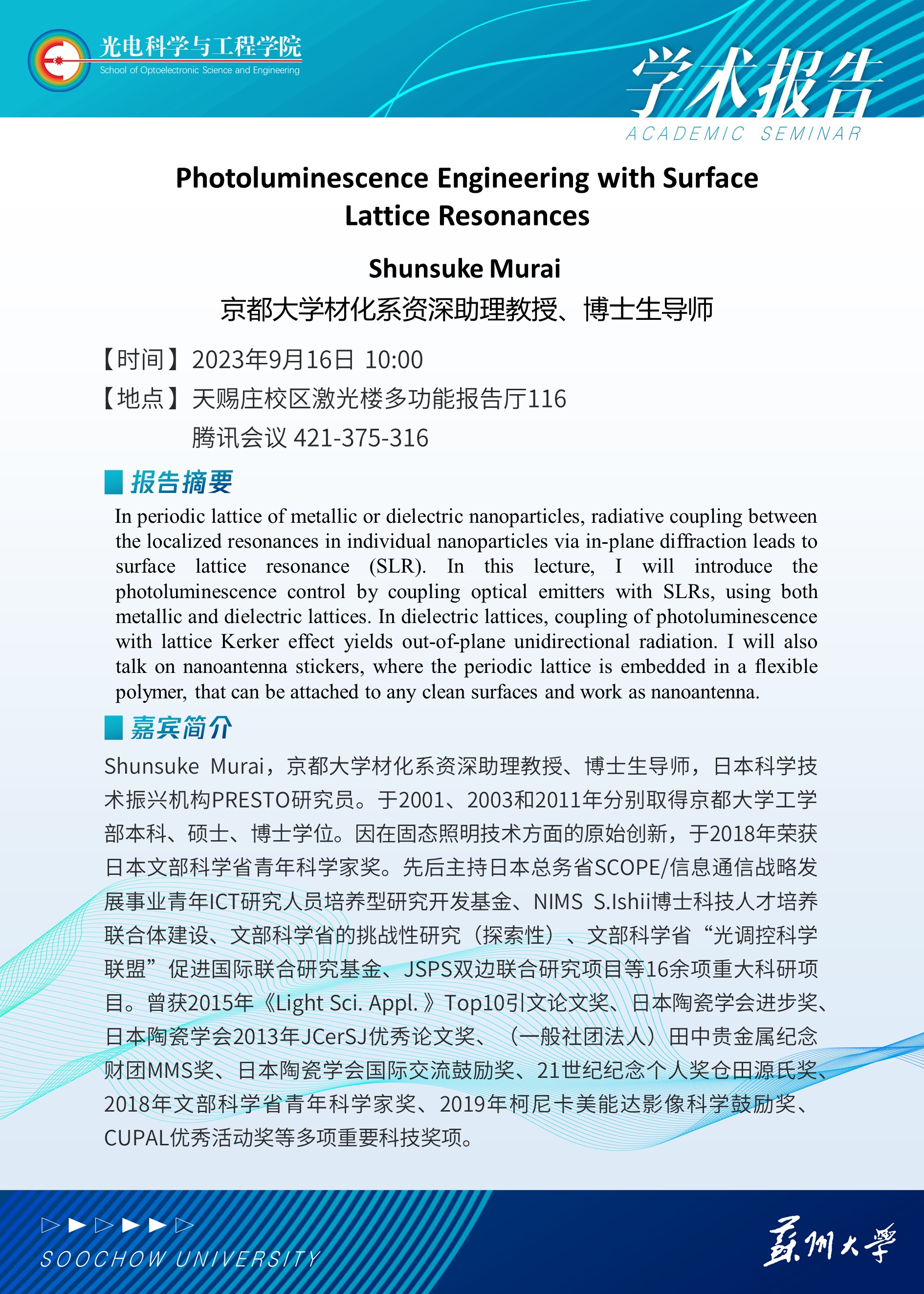 光电科学与工程学院学术报告:Photoluminescence Engineering with Surface Lattice Resonances