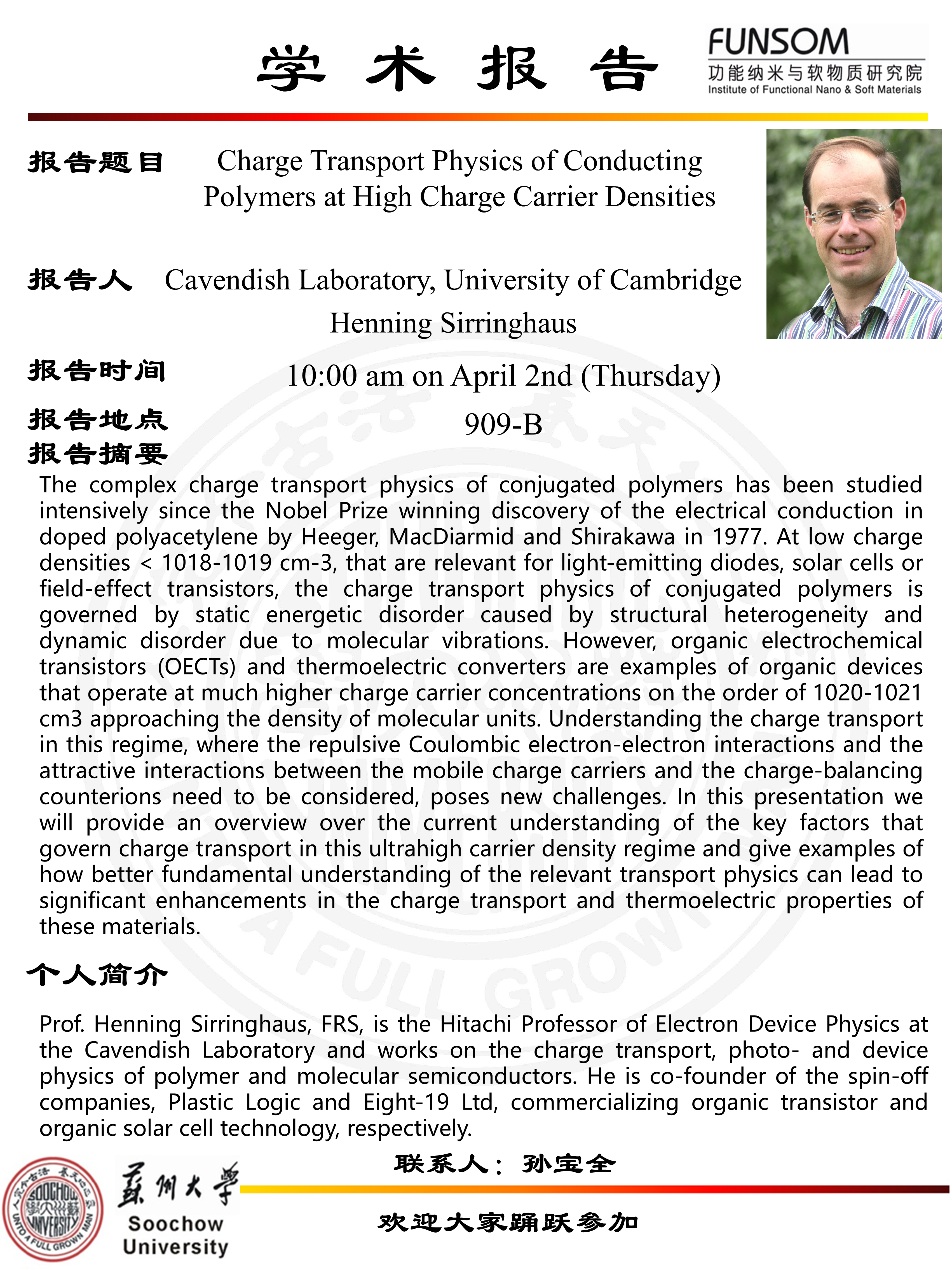 功能纳米与软物质研究院学术报告:Charge Transport Physics of Conducting Polymers at High Charge Carrier Densities