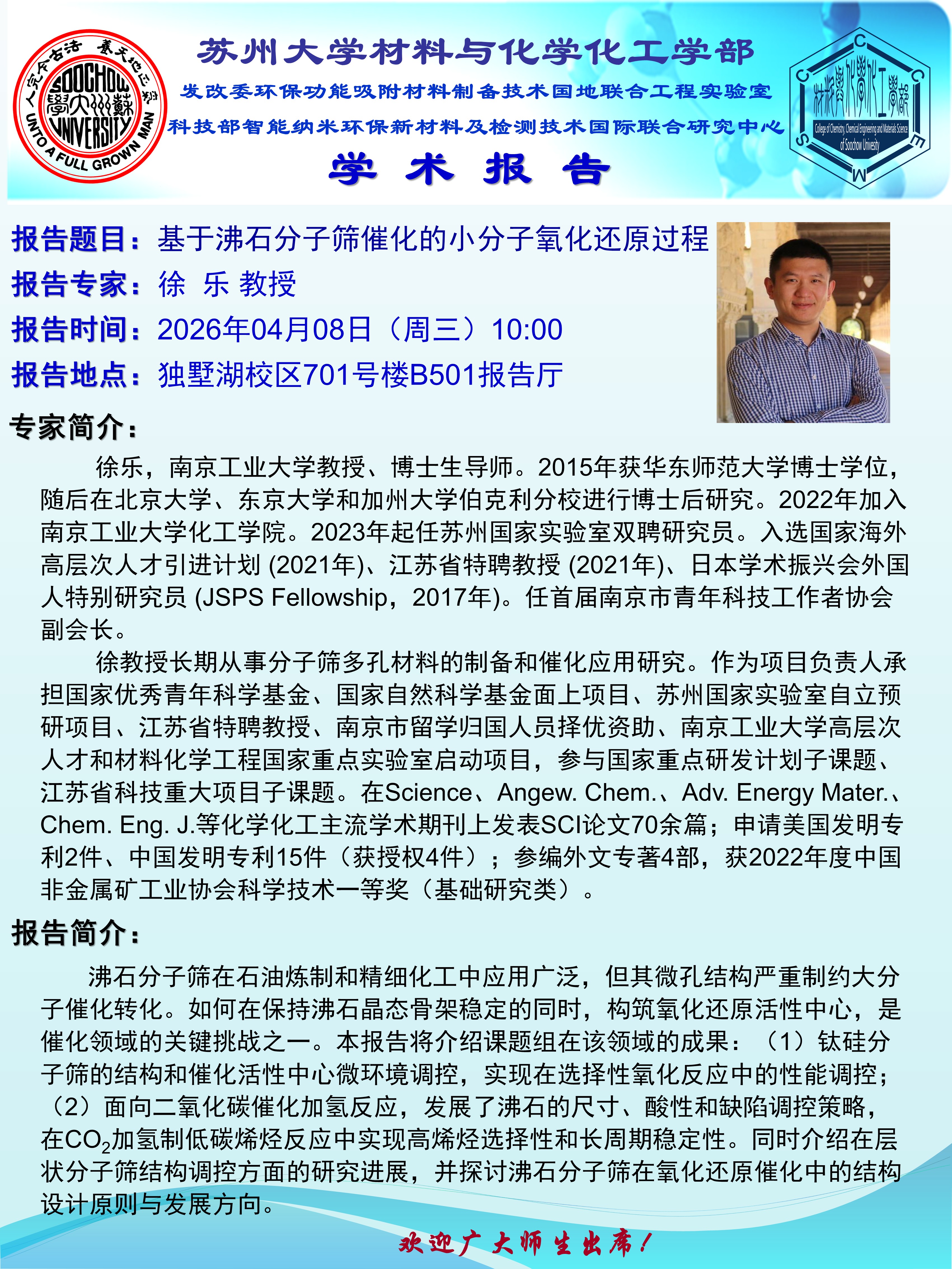 材料与化学化工学部学术报告:基于沸石分子筛催化的小分子氧化还原过程