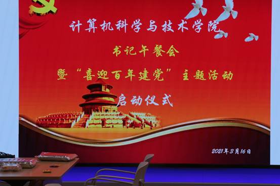 3月16日中午,计算机科学与技术学院“学史明志,传承红色基因,喜迎百年建党” 研究生党支部活动策划书记午餐会在理工楼214会议室举行。党委研究生工作部部长吴雪梅、计算机学院党委书记杨礼富、师生代表参加本次活动。本次活动由高珊老师主持。