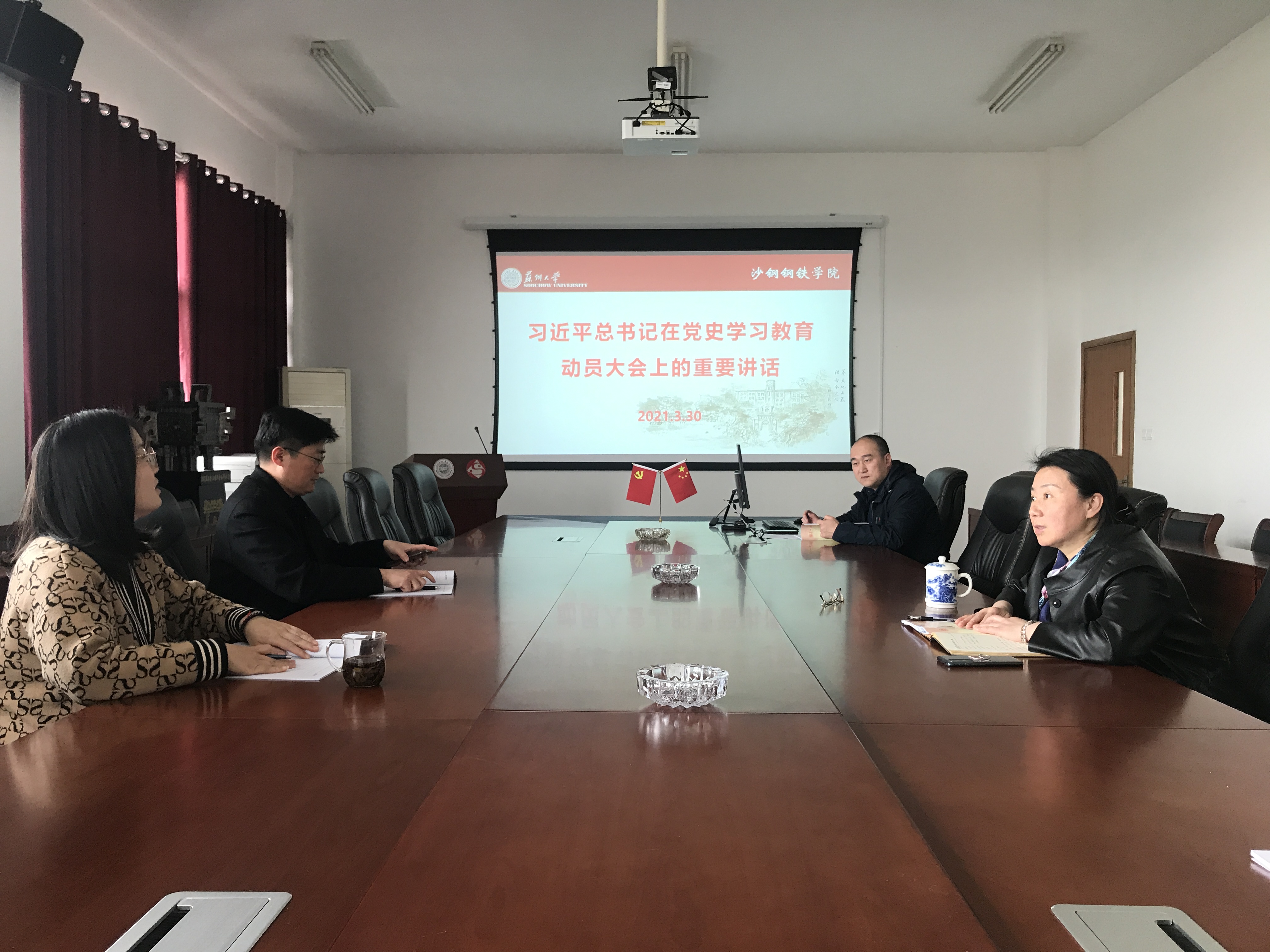 3月30日,沙钢钢铁学院党委理论学习中心组召开专题学习会,学习习近平总书记在党史学习教育动员大会上的重要讲话精神。会议由院党委书记宋清华主持,副书记徐海洋就本次专题学习领学并作重点发言。