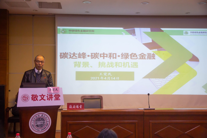 4月14日下午,中研绿色金融研究院执行院长王觉民老师做客敬文讲堂,主讲题为《碳达峰·碳中和·绿色金融的背景、契机与挑战》的专题讲座。讲座由敬文书院党委副书记、副院长孟玲玲主持。